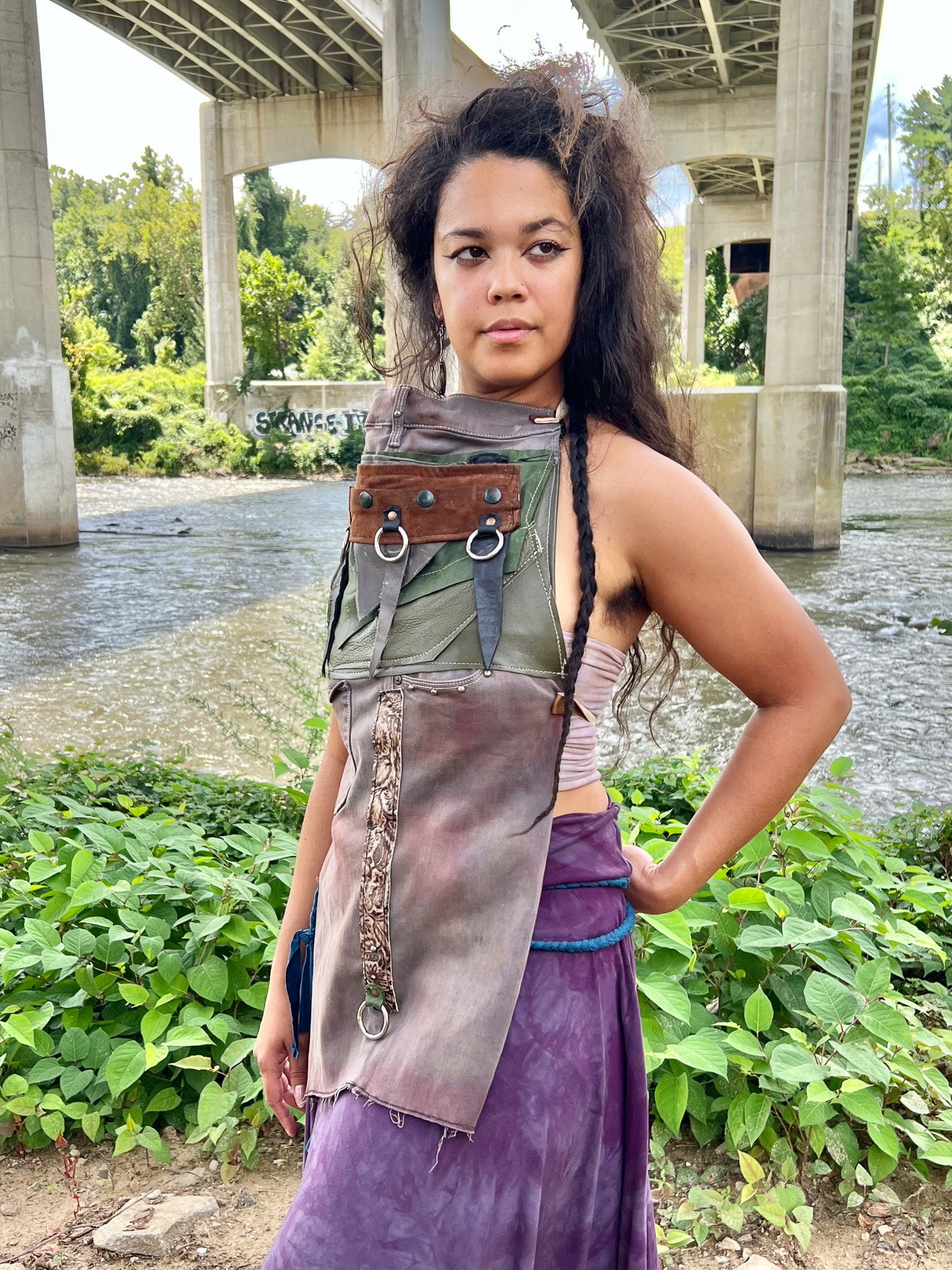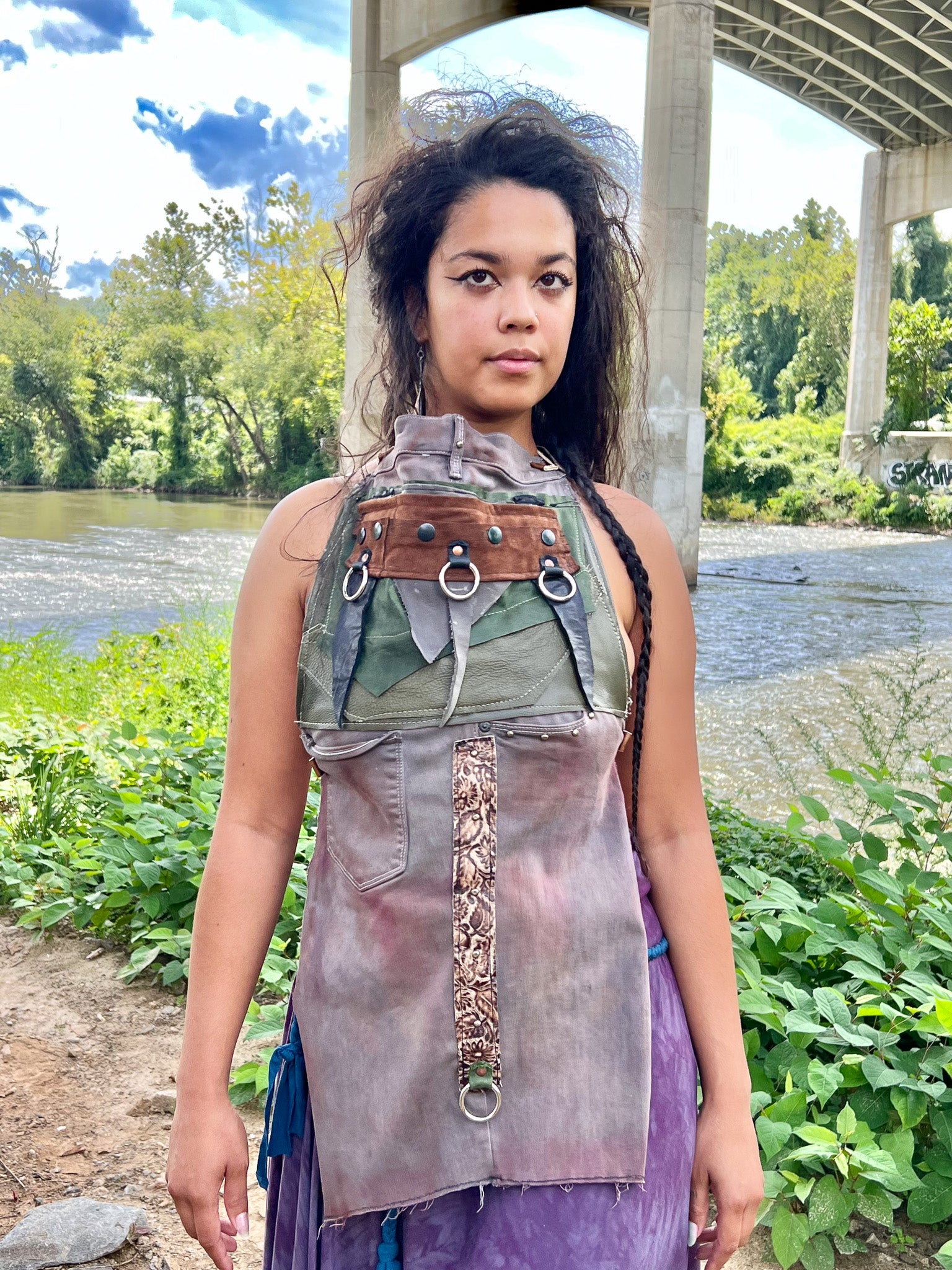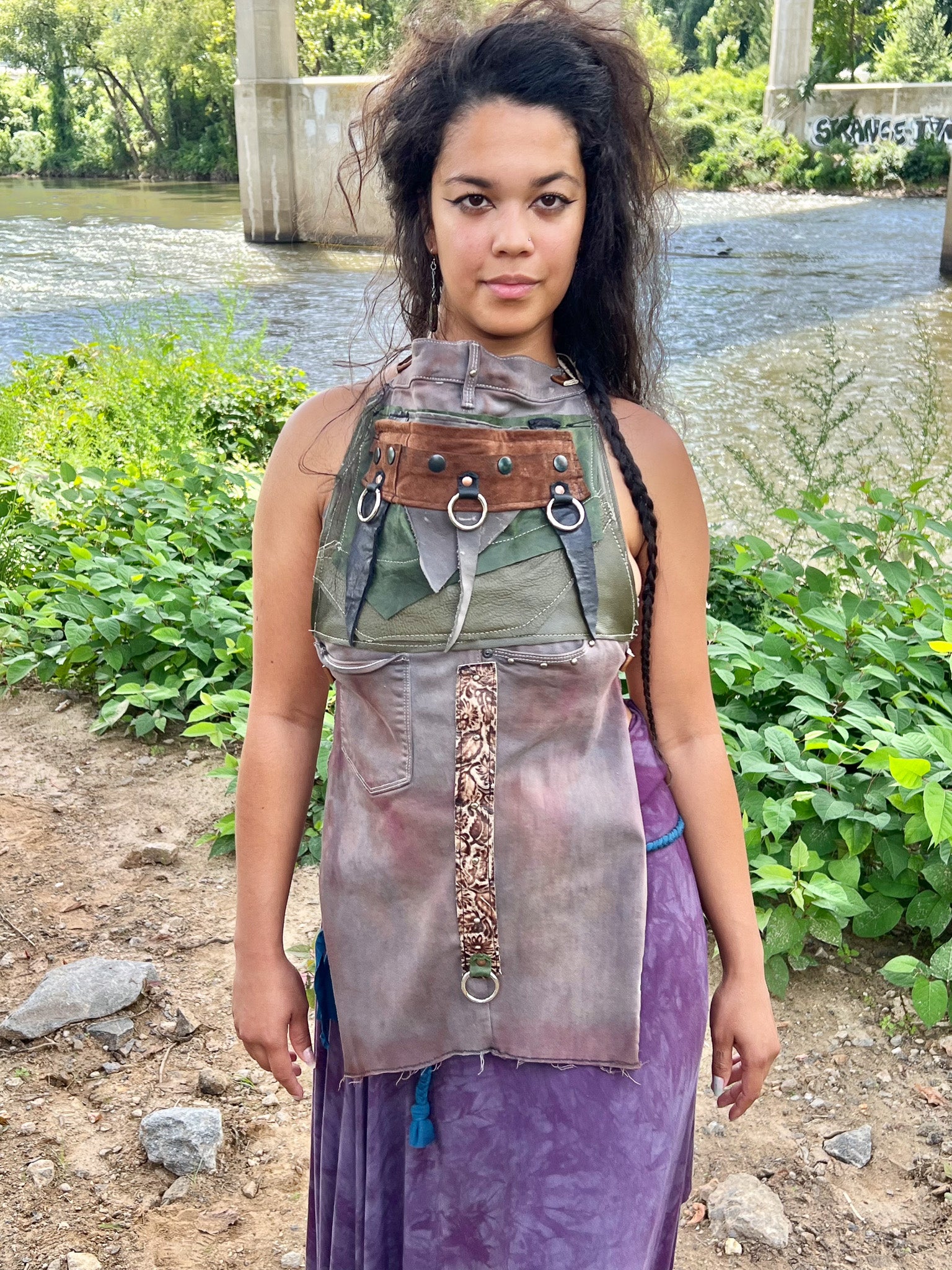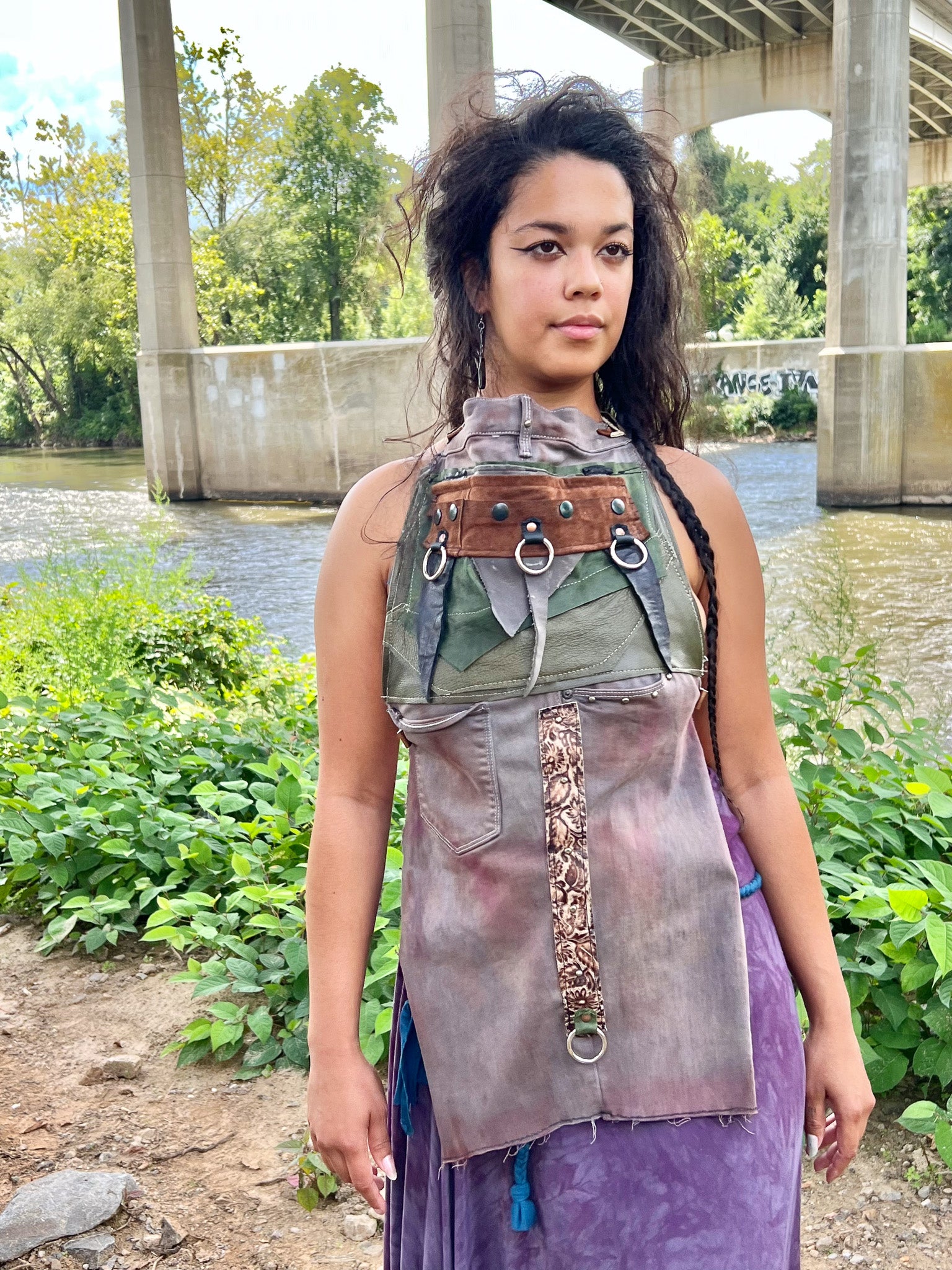 This Apocalyptic Halter Top combines handcrafted recycled denim and leather for a sustainable yet edgy look. Featuring industrial hardware rings and an open-back design, it offers a striking silhouette that balances structure and freedom. Leather tie cinchers add adjustable fit and a rugged, apocalyptic vibe, making it a standout statement piece with both durability and style.