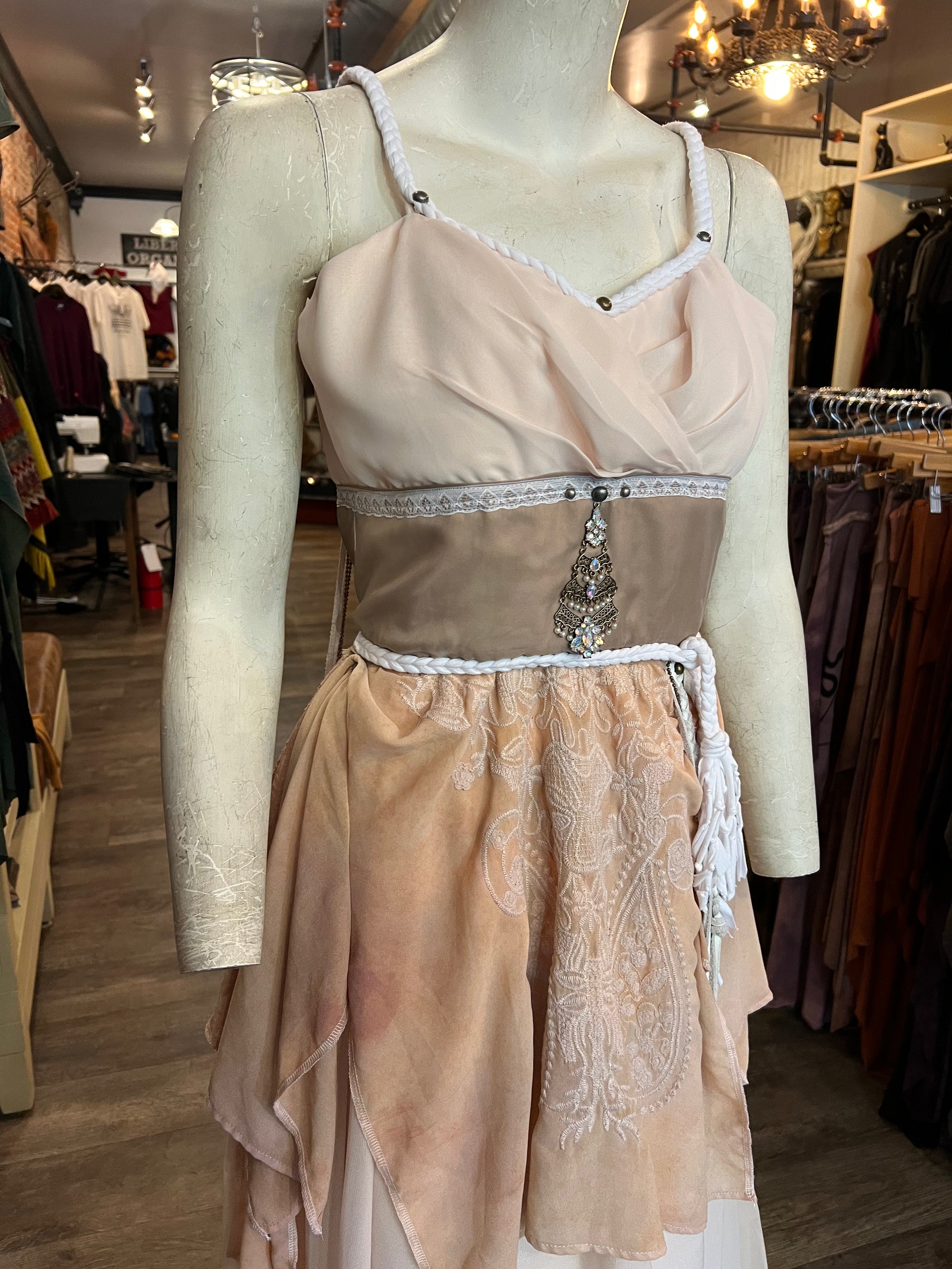 Made from upcycled sheer fabrics, this Apricot Princess Faerie Dress is lightweight and flowy. Detailed with antiqued brass and silver studs, braids, beaded chain and a rhinestone and faux pearl centerpiece.