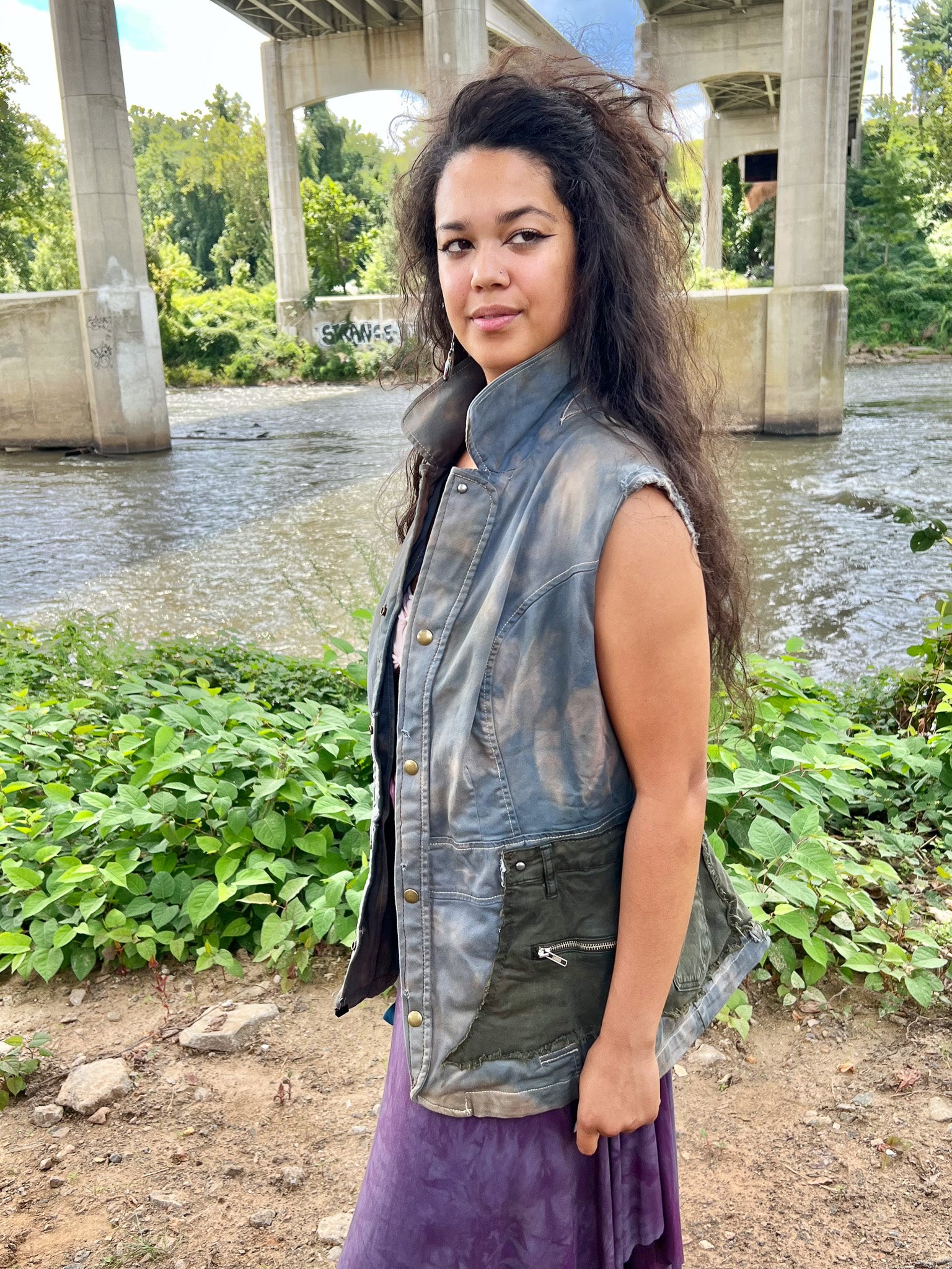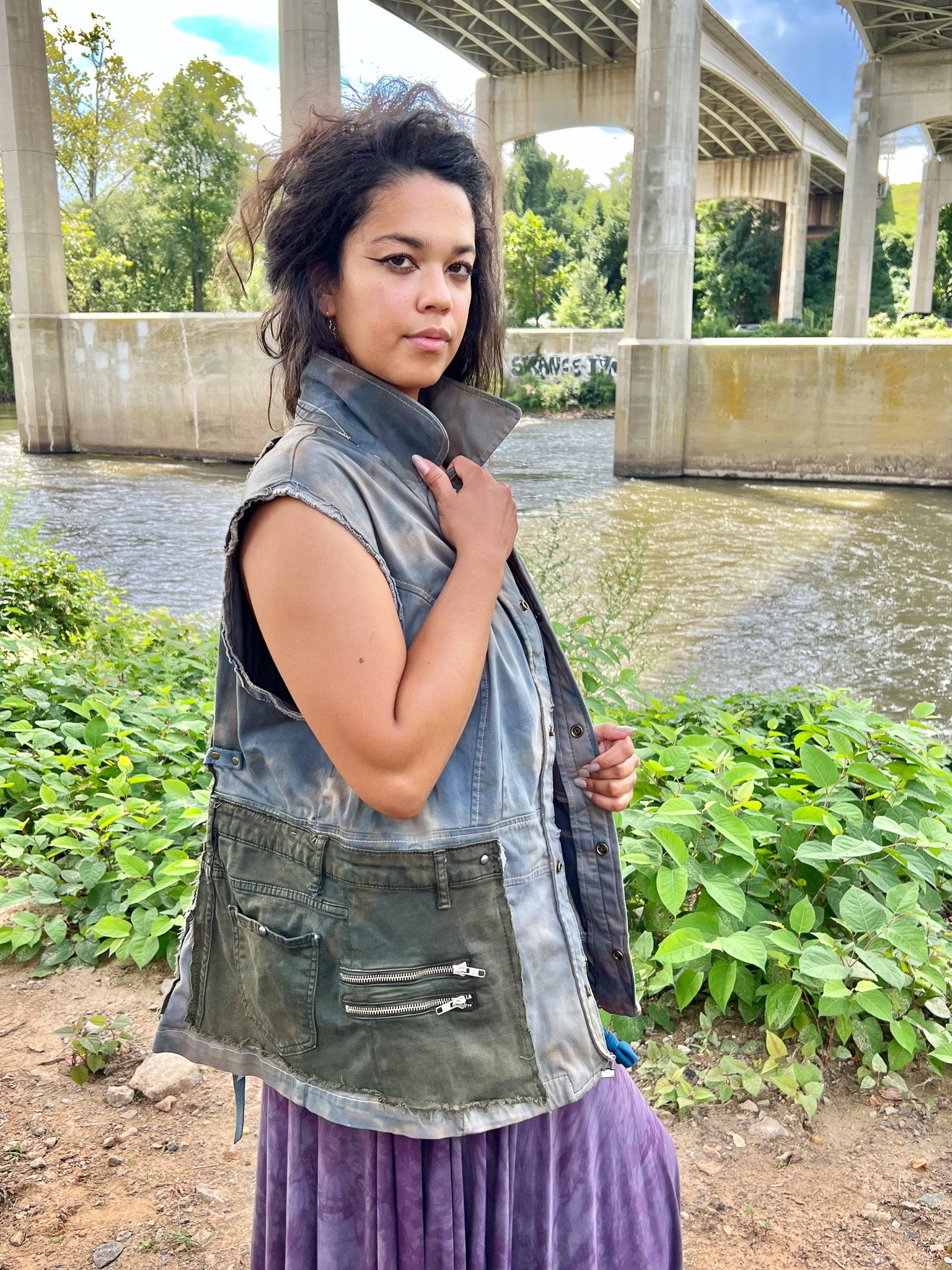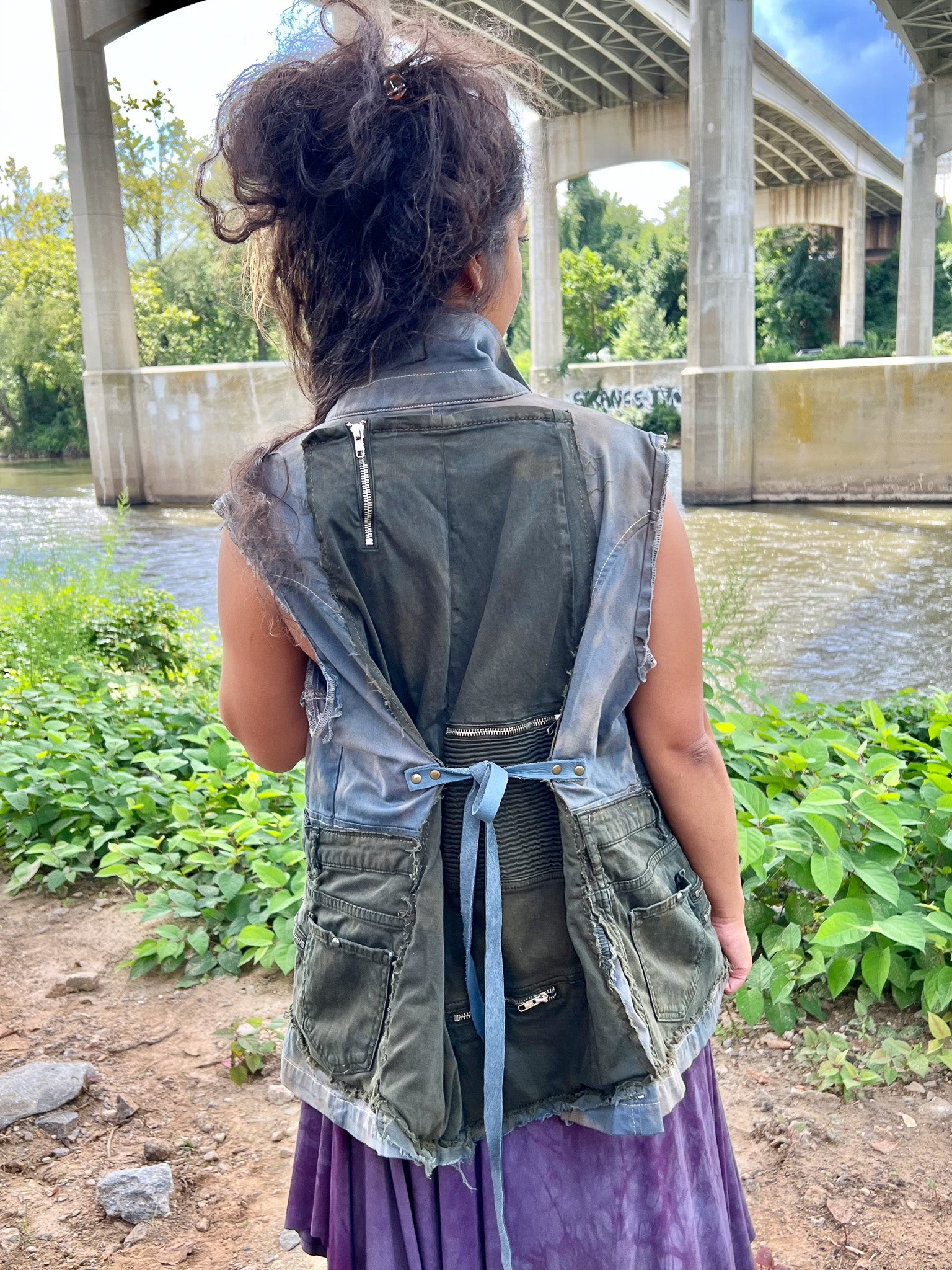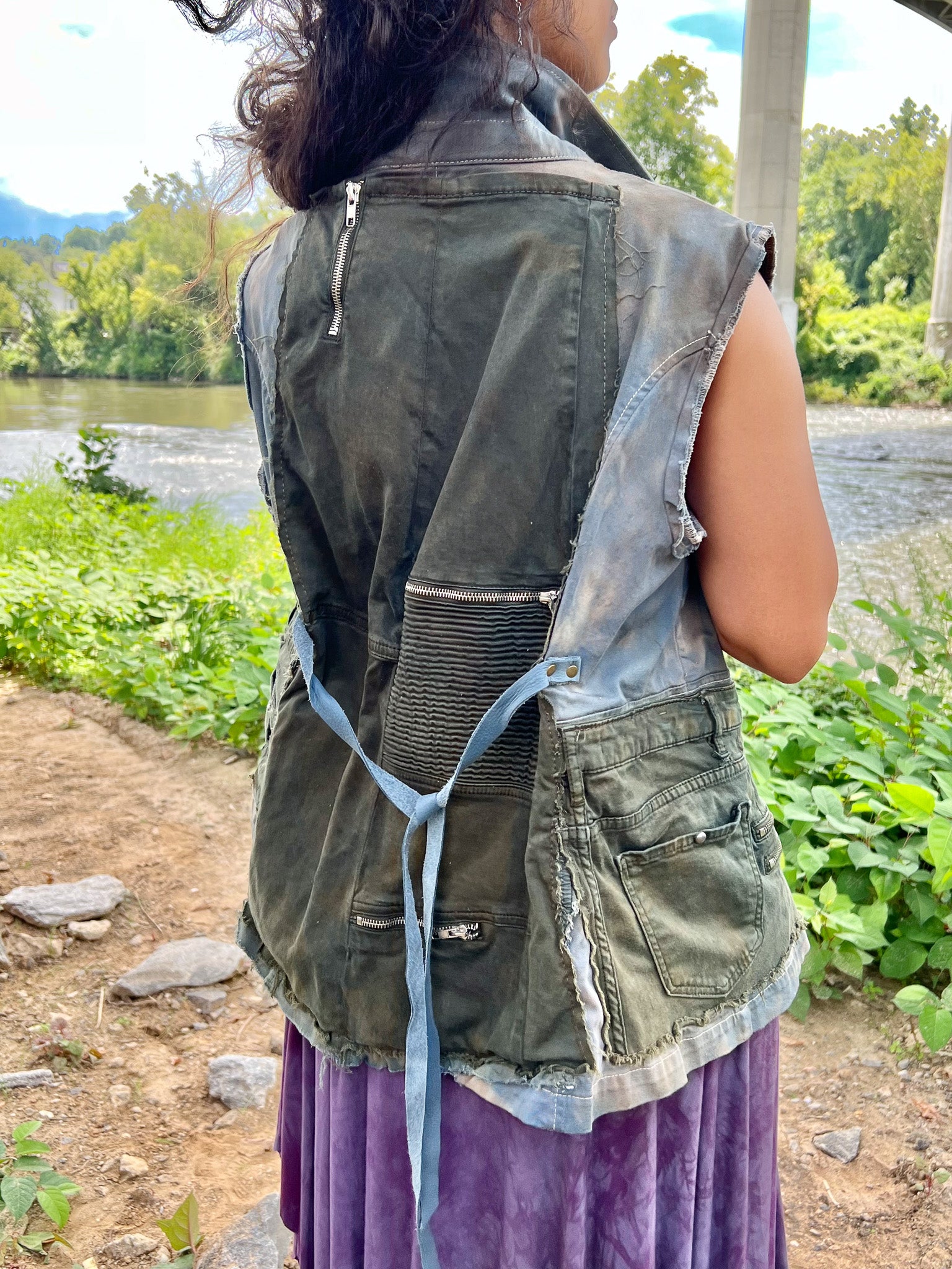This Army Green & Cyan Apocalyptic Vest is expertly handcrafted from recycled cargo materials and textiles, dyed a distinctive light blue with an edgy, apocalyptic aesthetic. Featuring multi-pocket storage for practical organization, it is designed with cincher ties in the back to provide a customizable, sculpted fit. This vest blends sustainable craftsmanship with functional design, perfect for those seeking both style and utility.