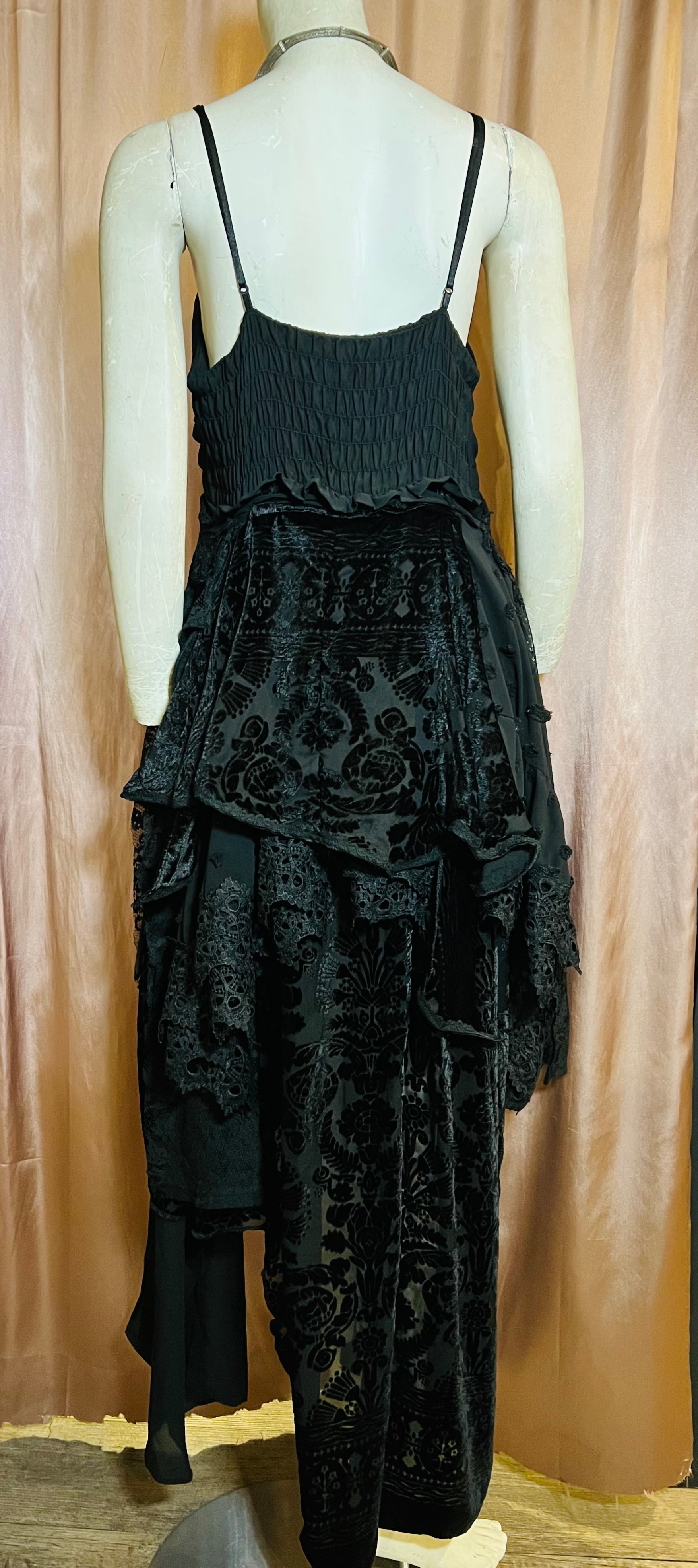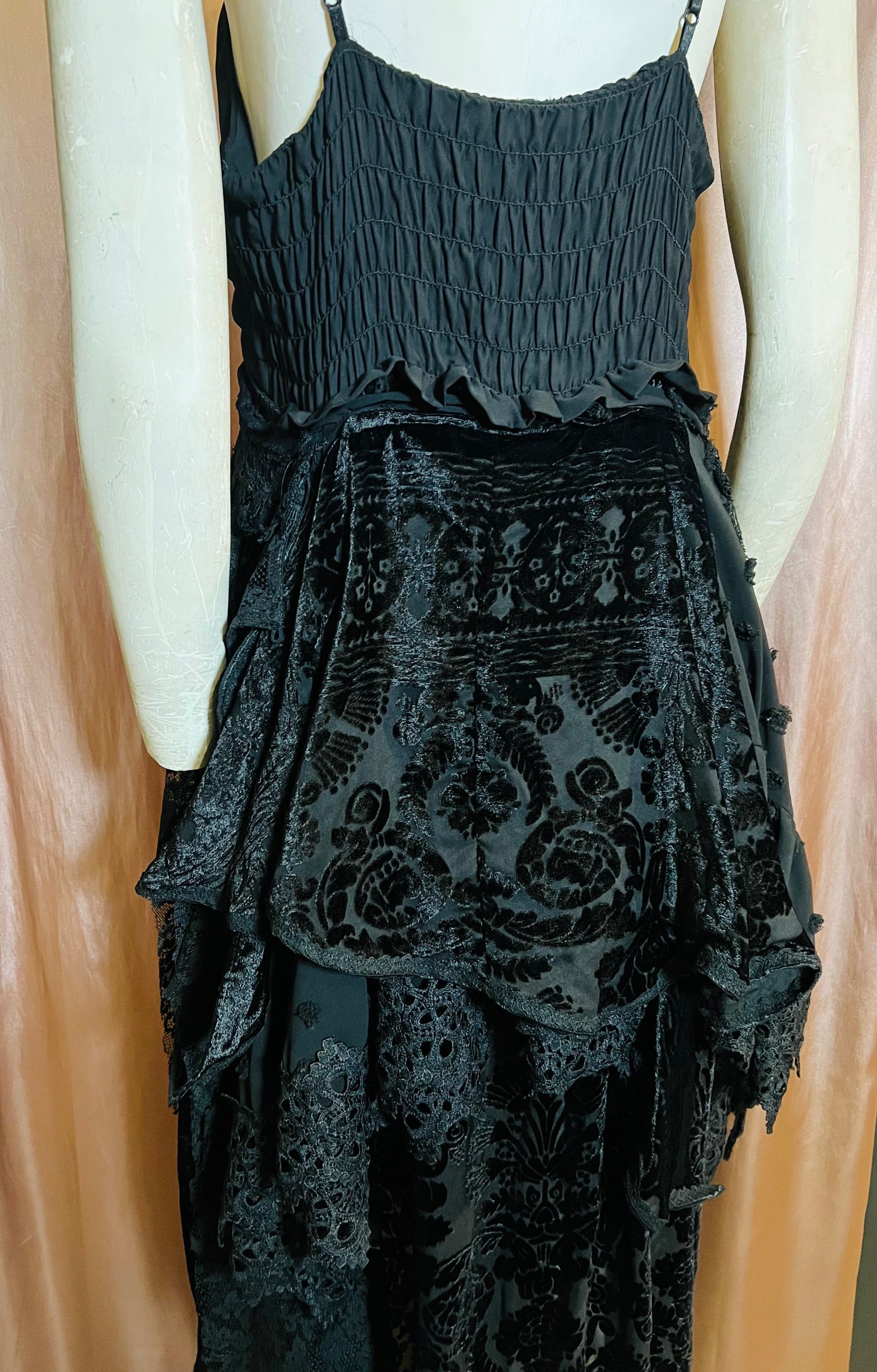 Layers of beautiful black sheer fabric and lace cascade down from the empire waist of this elegant gown, detailed with velvet accents and black lace trim. With a smocked back and adjustable shoulder straps, this easy-to-wear gown can accommodate a range of sizes.