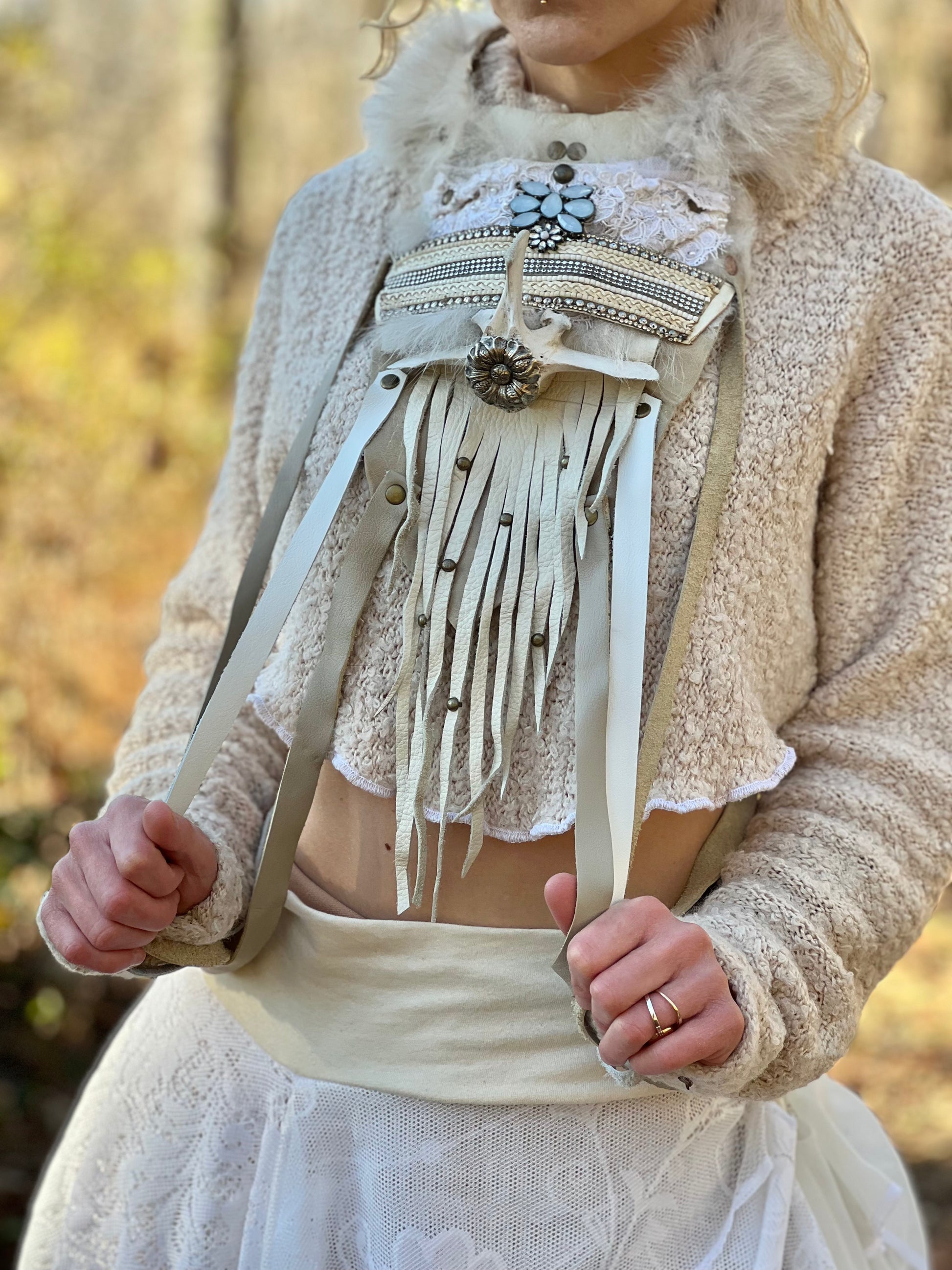This handcrafted neck harness merges raw materials into a striking ritual art piece. Constructed from post-manufactured scrap leather with hand-cut fringe detailing, it features found deer vertebrae and vintage silver fox fur for authentic textural depth. The snap closure at the neck ensures secure wear during performance or statement occasions. A bold accessory for those who embrace unconventional adornment and ceremonial aesthetics.