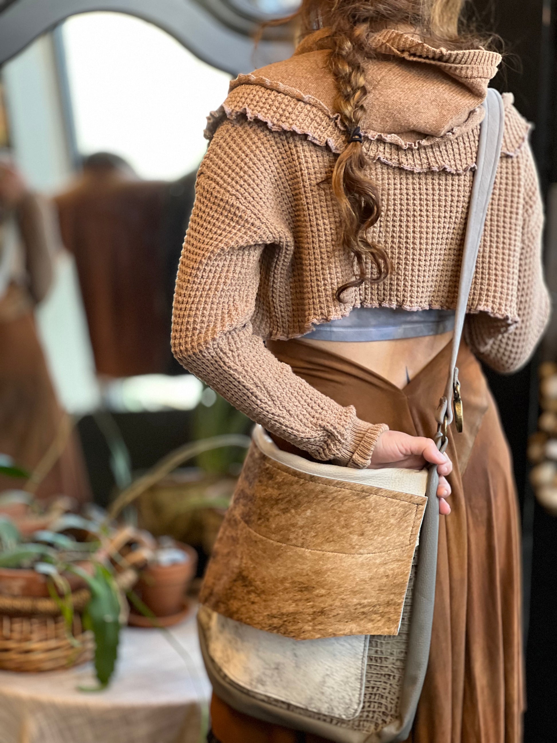 Constructed from all high-end, post-manufactured reclaimed leather, this beautiful and roomy, hair-on-hide, embossed alligator and grey leather messenger bag provides ample space for your laptop and notebooks for heading out to your favorite coffee shop for a cozy workday, or room for a change of clothes for after a good afternoon of exercising at the gym.