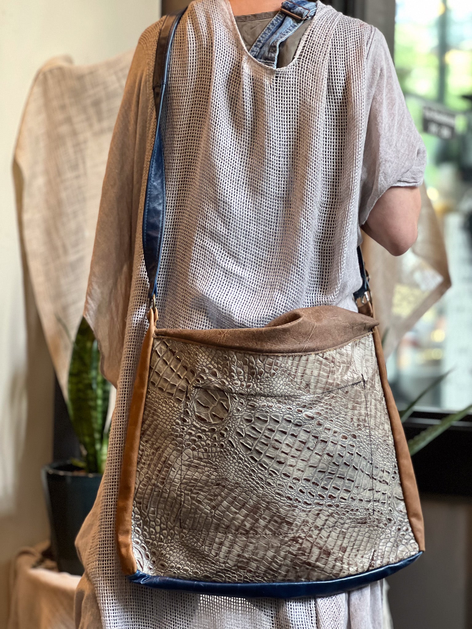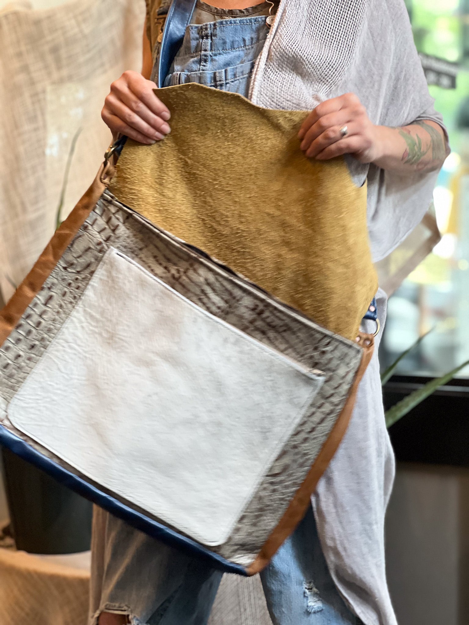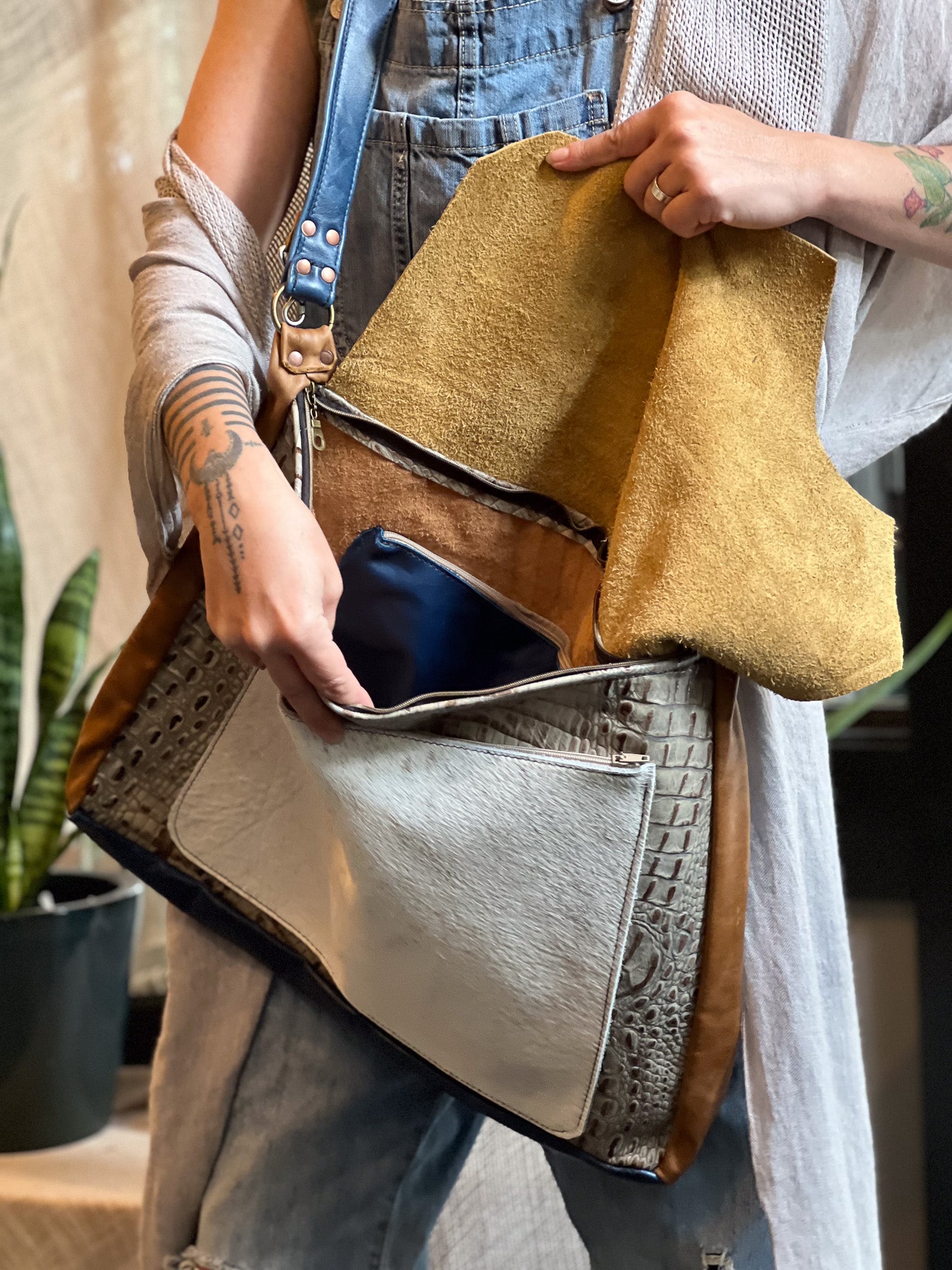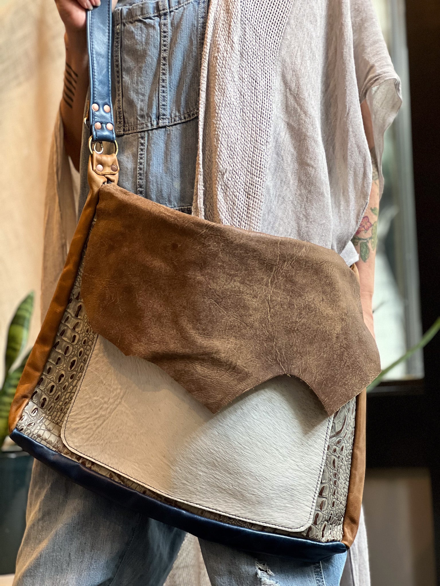 Constructed from all high-end, post-manufactured scrap leather, this beautiful and roomy, leather messenger bag provides ample space for your laptop and notebooks for heading out to your favorite coffee shop for a cozy workday, or room for a change of clothes for after a good afternoon of exercising at the gym.