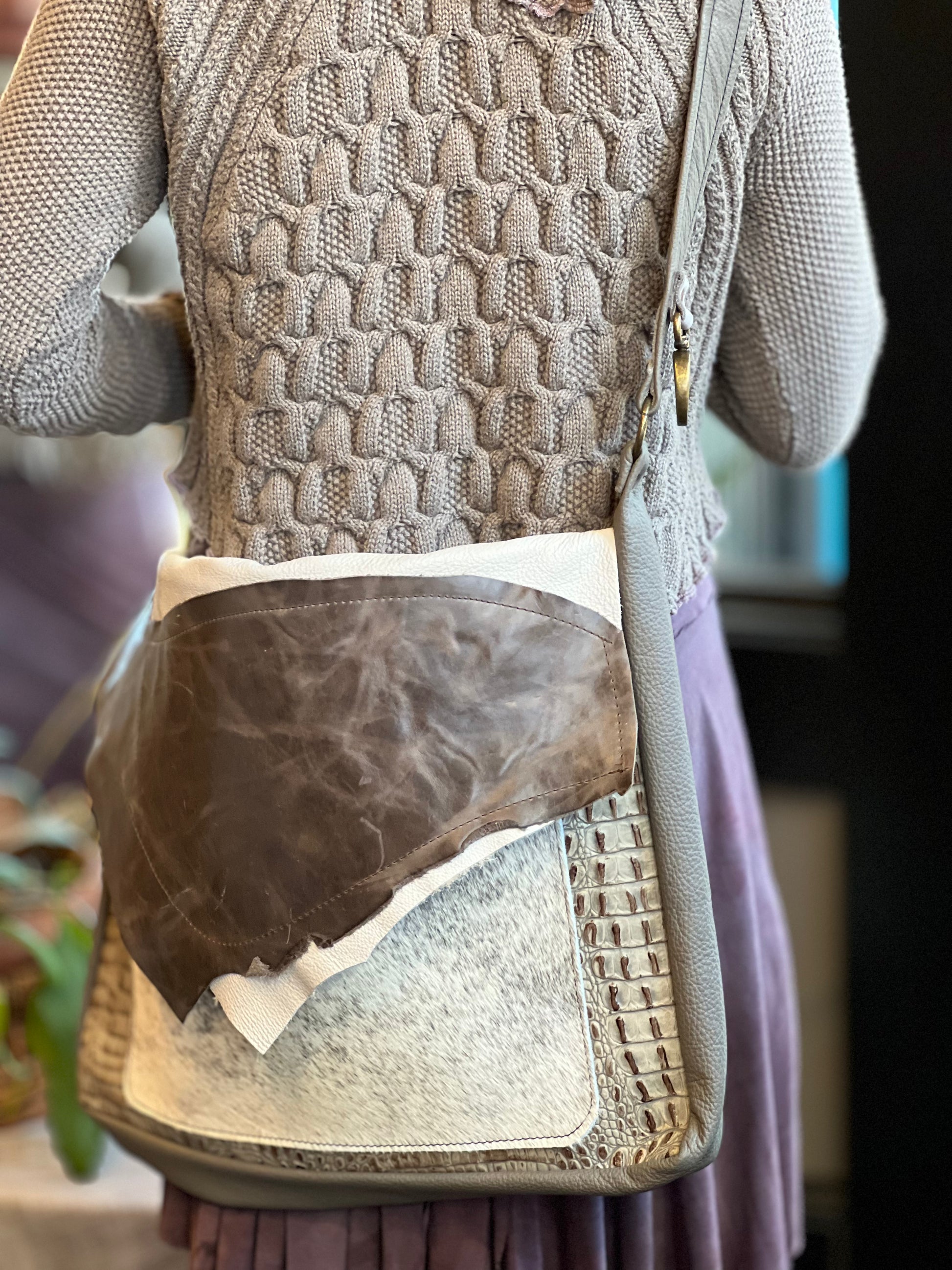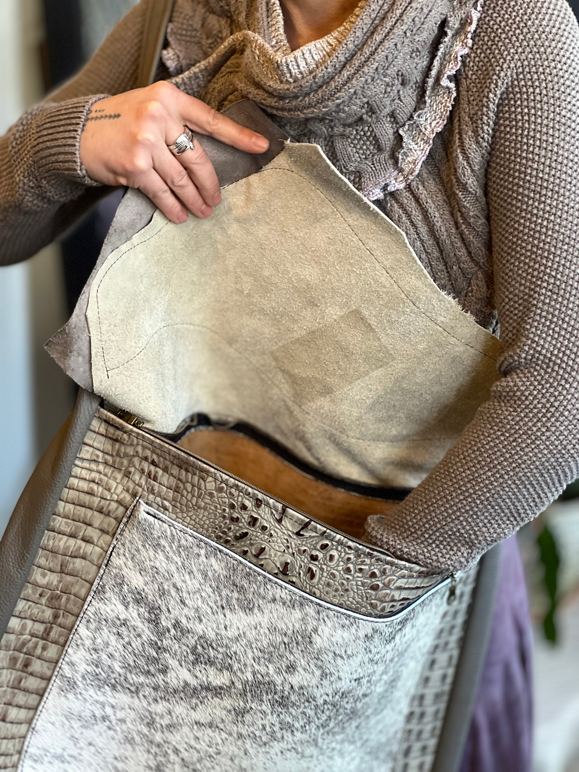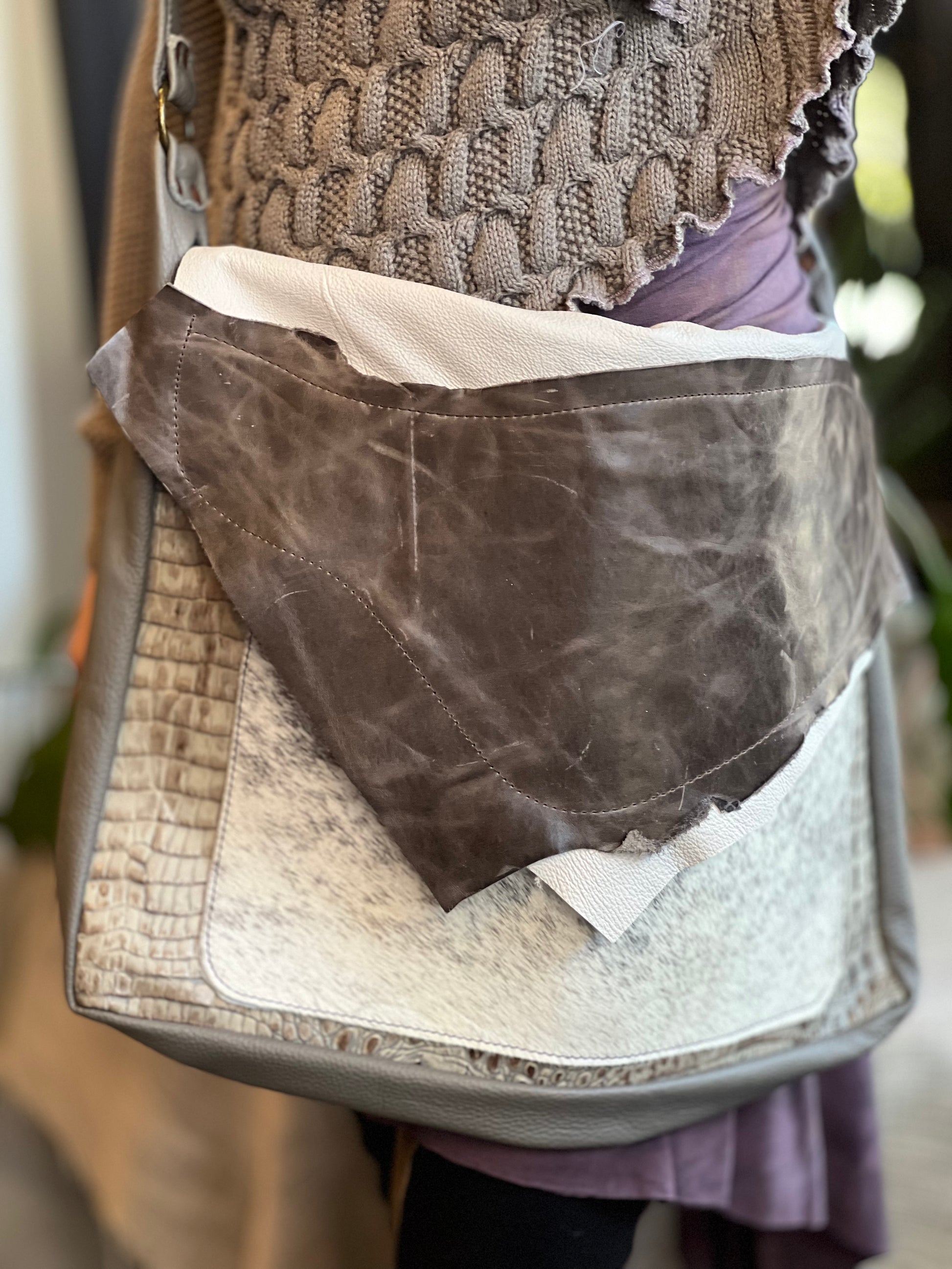 Constructed from all high-end, post-manufactured reclaimed leather, this beautiful and roomy, hair-on-hide, embossed alligator and grey leather messenger bag provides ample space for your laptop and notebooks for heading out to your favorite coffee shop for a cozy workday, or room for a change of clothes for after a good afternoon of exercising at the gym.
