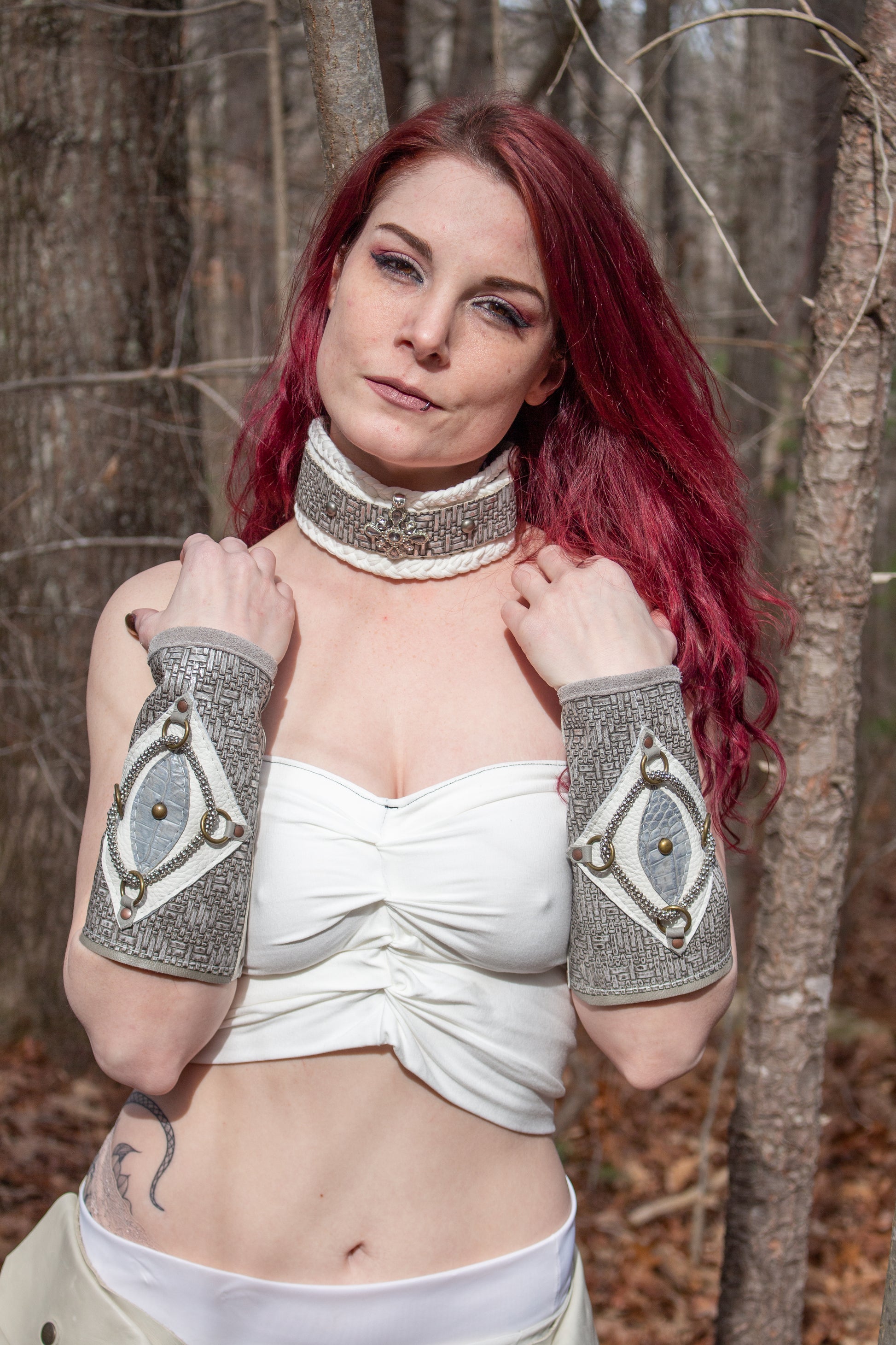 Beautifully handcrafted by the creators at Royal Peasantry, this white choker collar is constructed from reclaimed leather and braided scrap bamboo/rayon fabric from our Athena line. Detailed with antiqued silver studs, this choker features a stunning vintage pendant of smokey grey and silver rhinestones as its centerpiece. For adjustability and easy on/off, this white choker collar has two leather ties at the back of the neck.