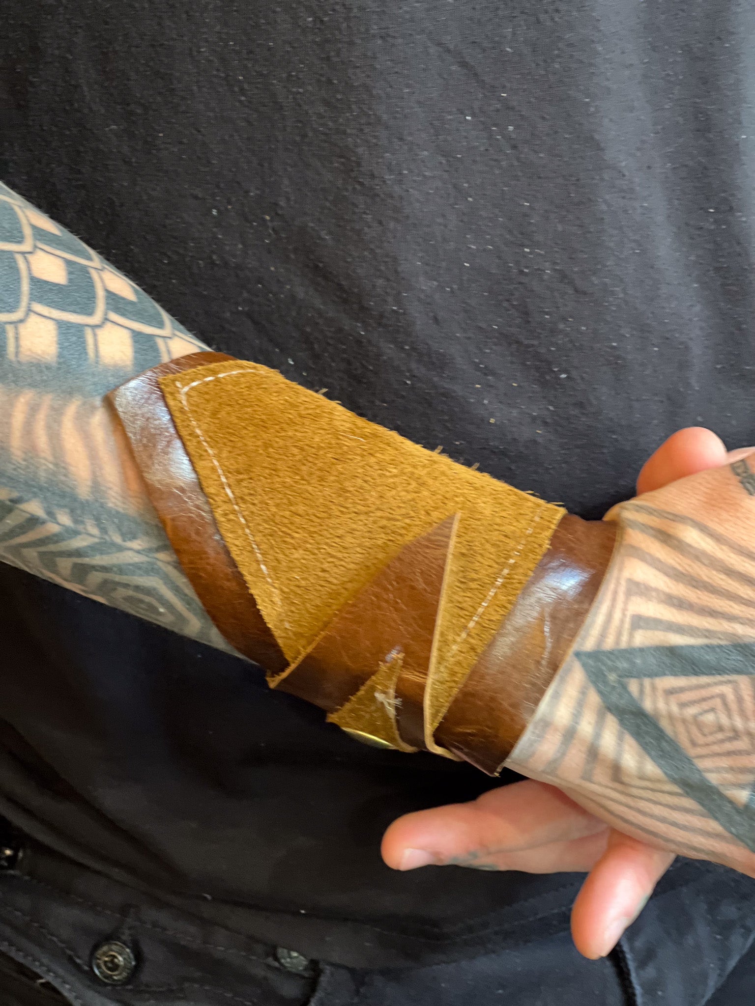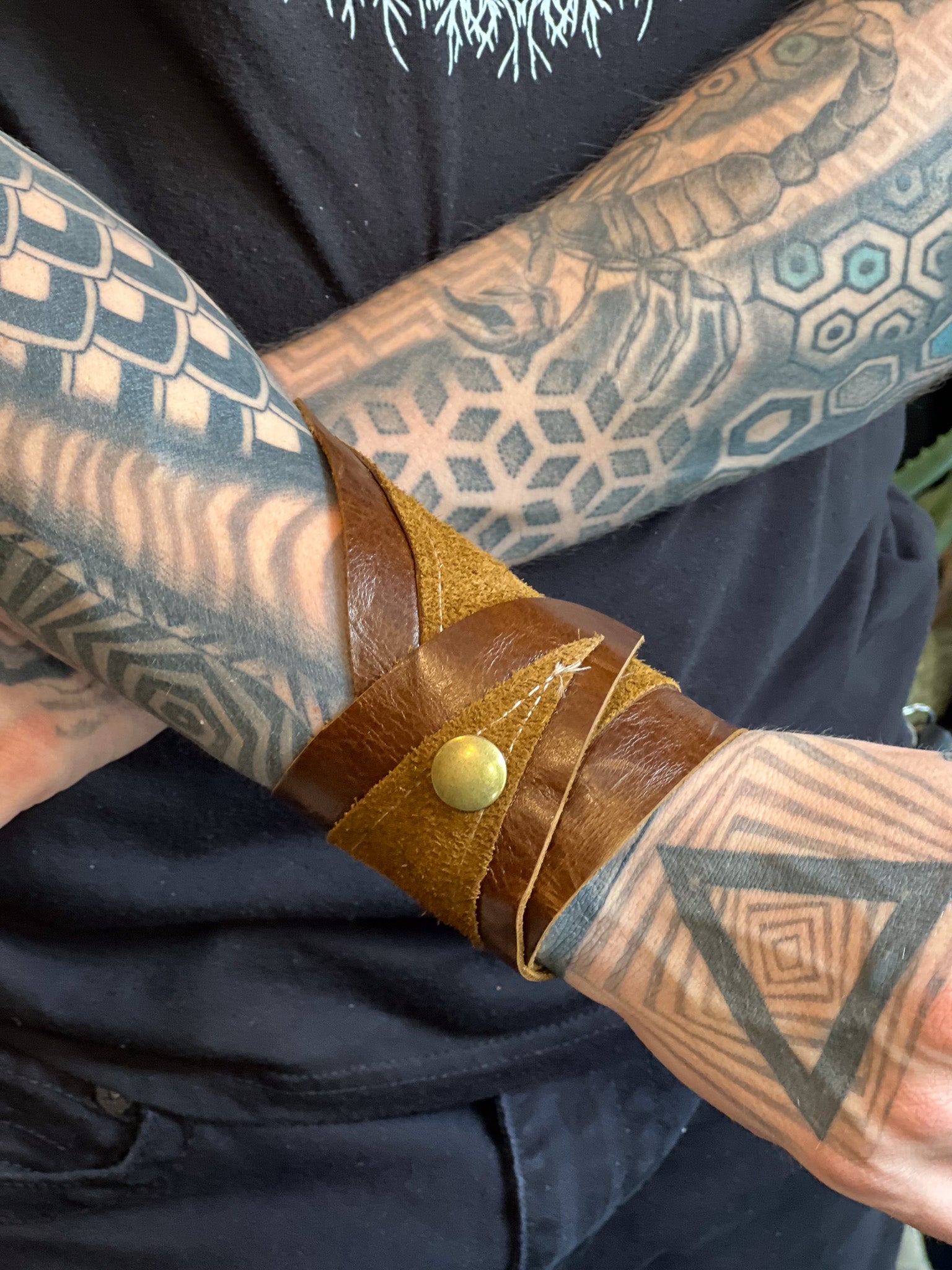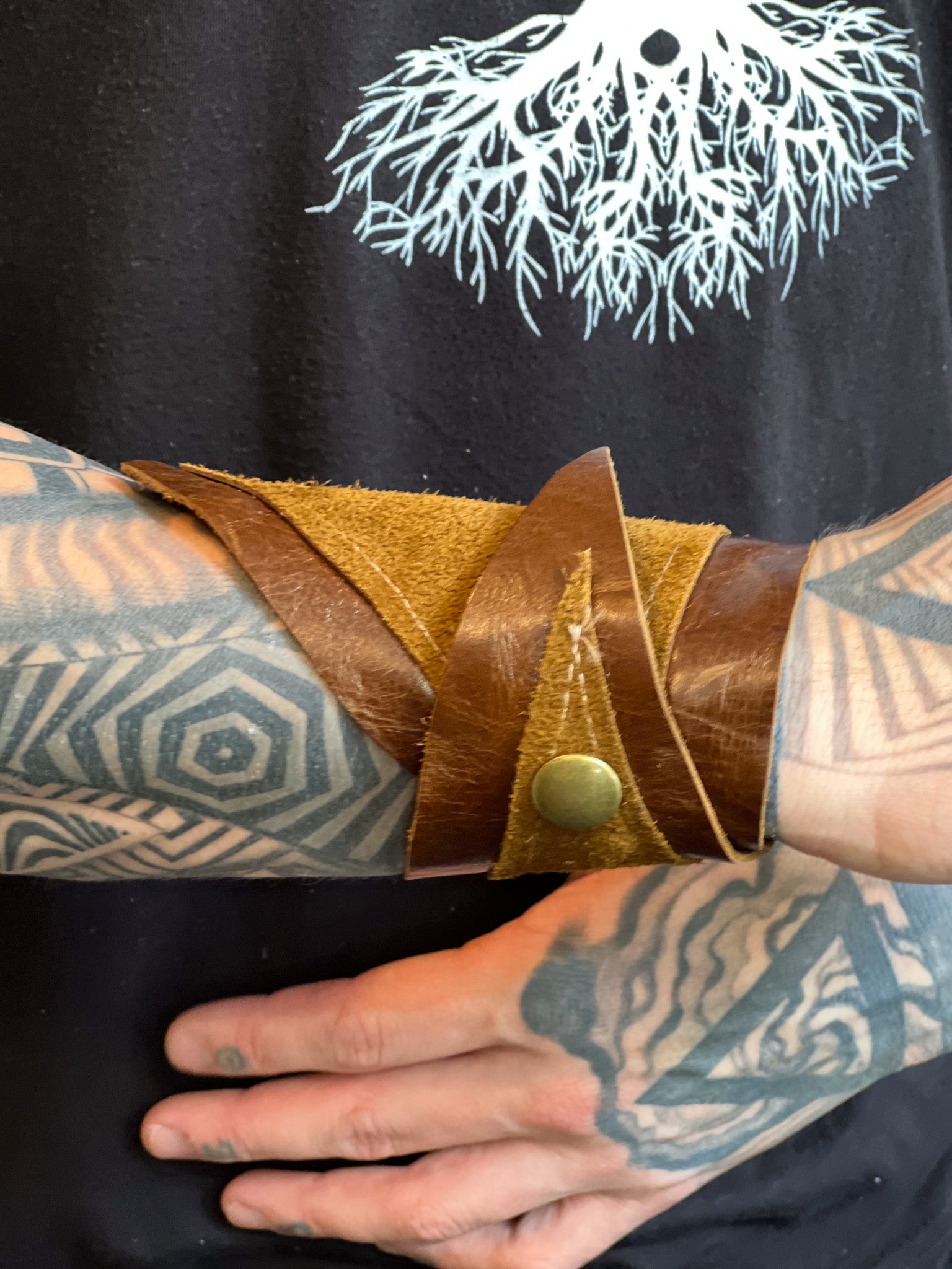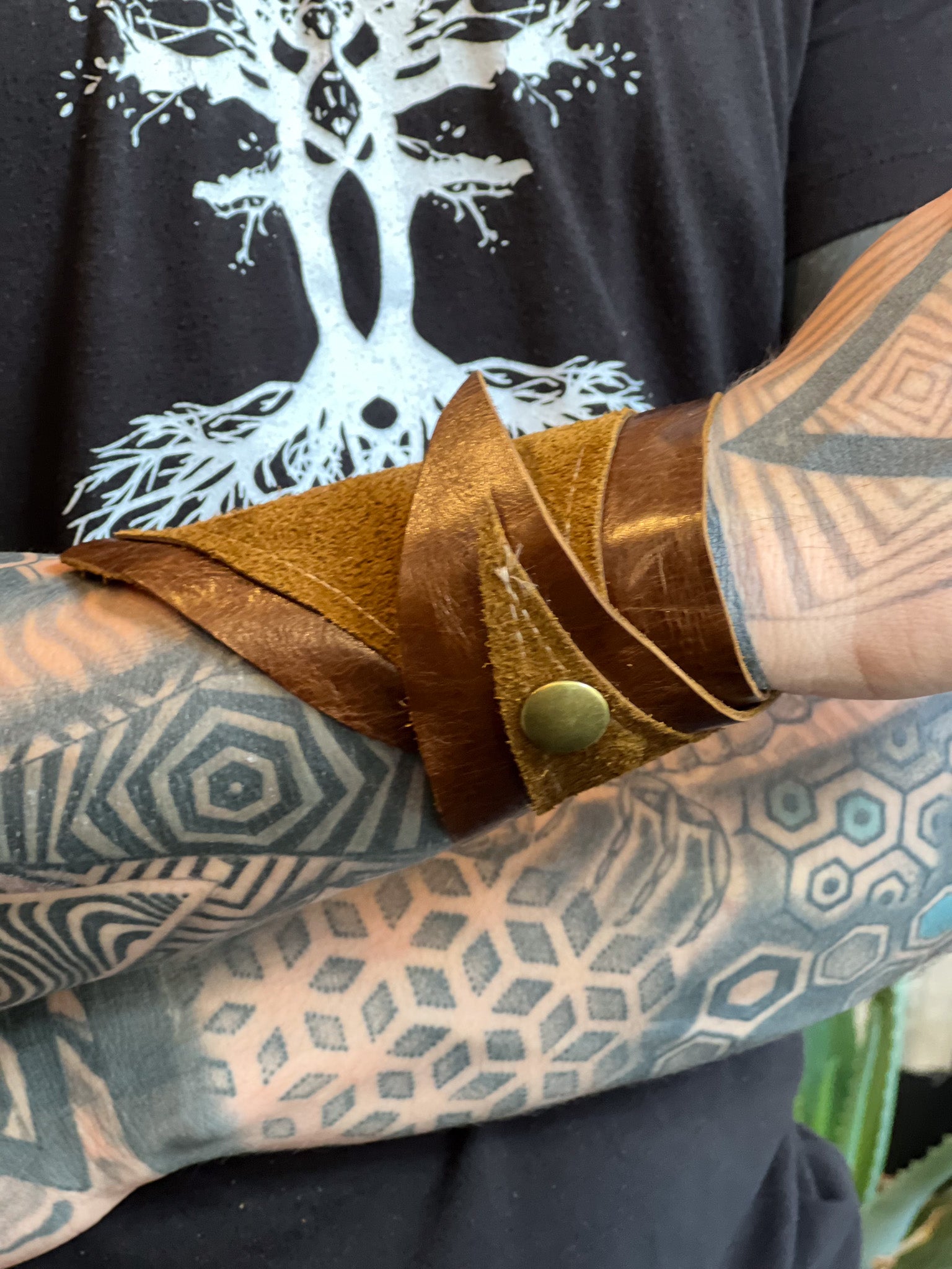 Crafted from recycled leather sourced from Vanguard, this Chestnut Scrap Leather Cuff combines sustainability with refined design. Featuring a rich chestnut and suede color palette, the cuff offers a sophisticated yet rugged aesthetic. Its industrial snap closure ensures a secure fit, making it both a durable and stylish accessory for everyday wear.