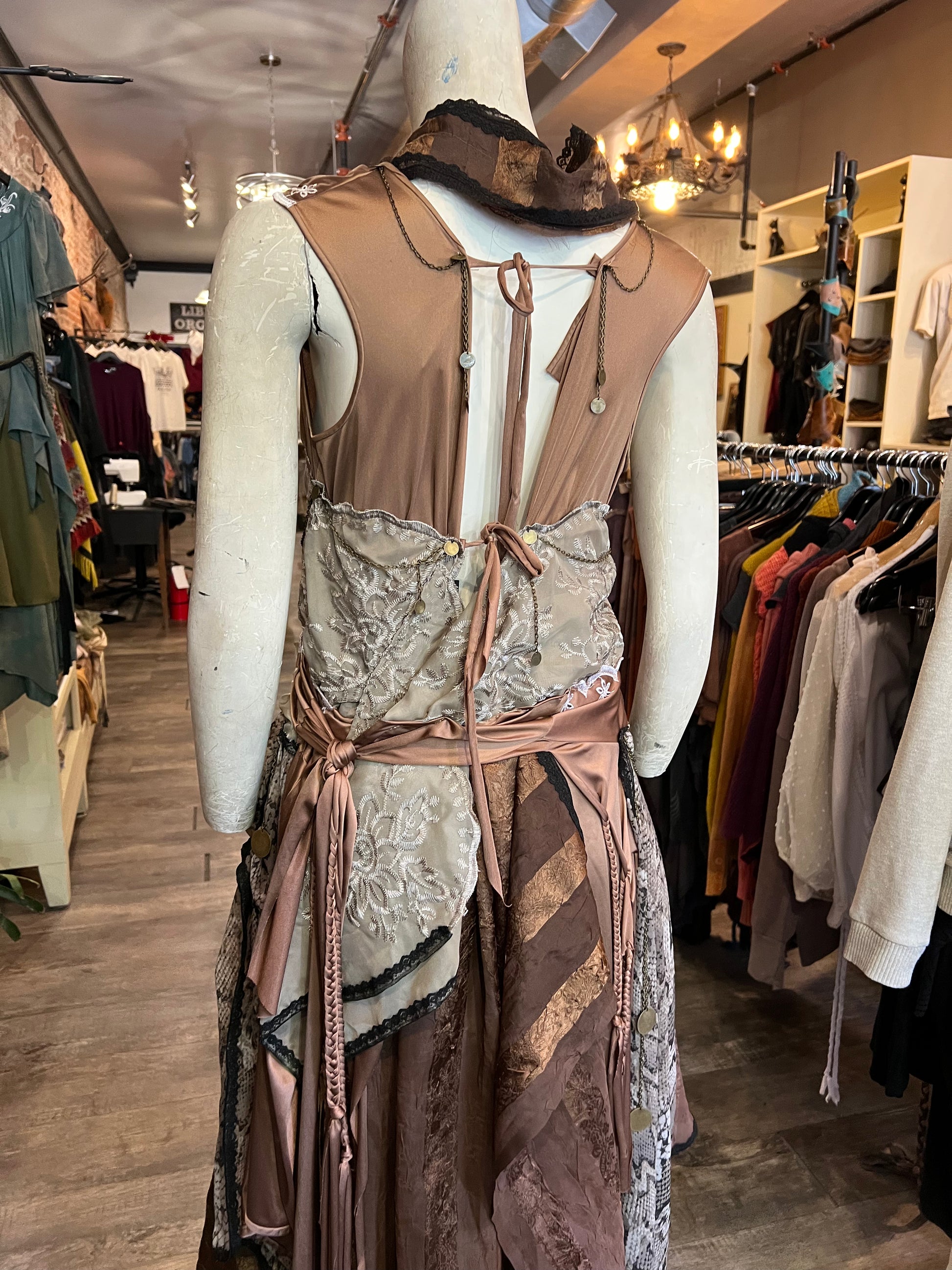 This stunning dress is crafted from a variety of silky, satin and sheer upcycled fabrics and trimmed in black lace. Detailed with antique brass chain and discs, and perfectly draped flowy material, you are bound to be catching admiring gazes of any event.
