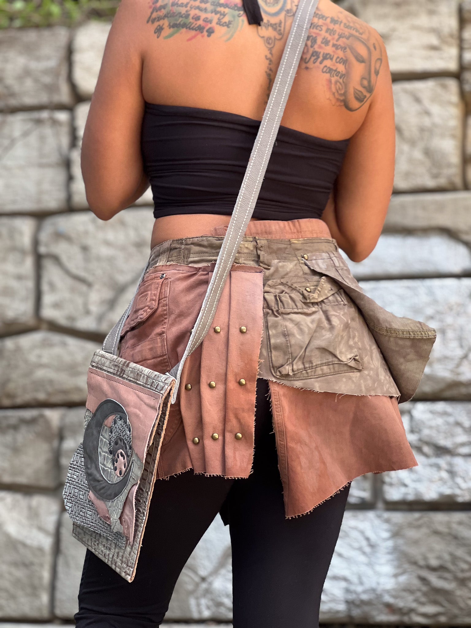 Patchwork pinks, greys, and embossed exotics create a soft and fierce essence in this collection. An expertly crafted crossbody bag is crafted using post-manufactured scrap leather, lending it a distinct texture and color. The primary compartment showcases a sophisticated alligator embossed pattern, complemented by industrial hardware rivets for added durability. Make a fashion statement while minimizing your carbon footprint.