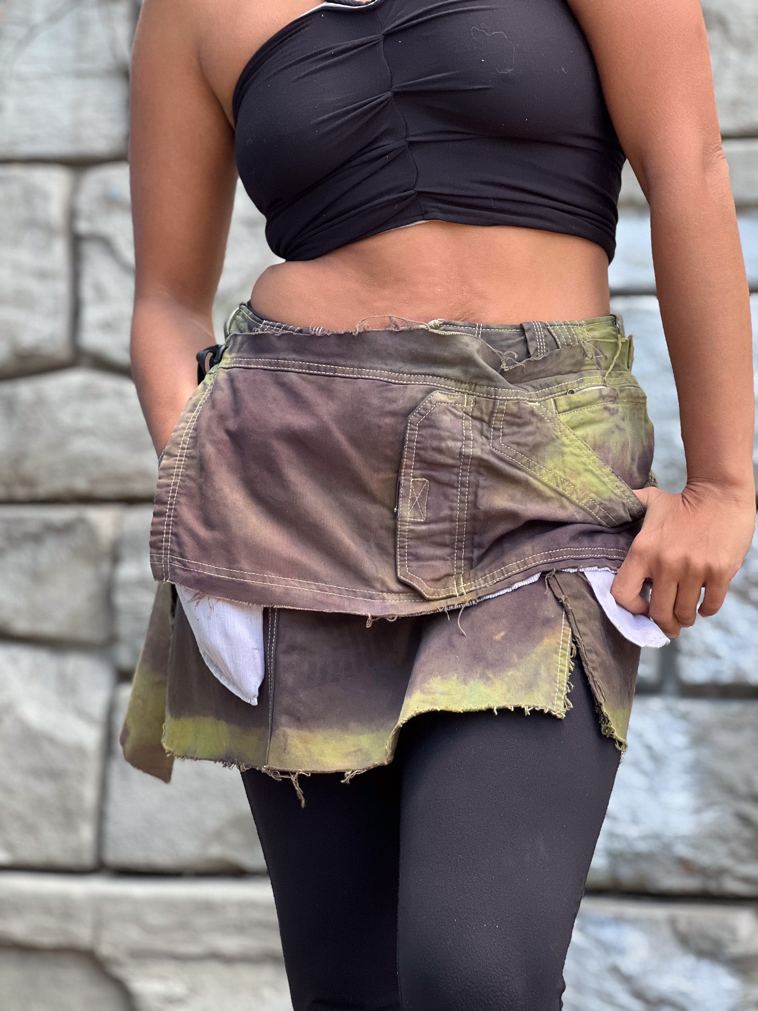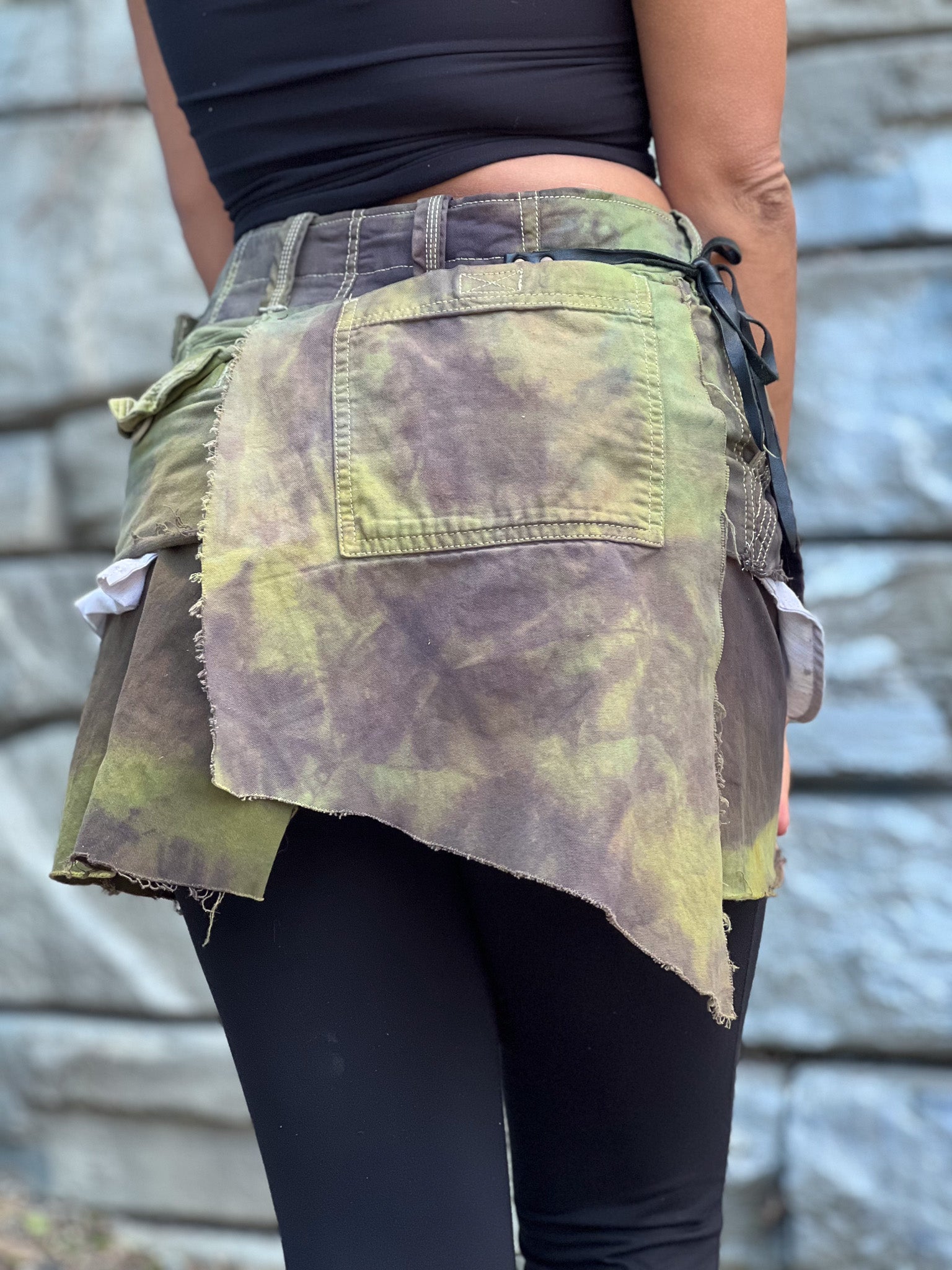 Expertly handcrafted from upcycled cargo pockets and textiles, our Apocalyptic Cargo Mini Skirt combines post-apocalyptic style with sustainability. Each skirt is one-of-a-kind and features a unique hand-dyed design. The leather tie closure adds a touch of edgy sophistication. Embrace your inner Mad Max with this must-have piece.