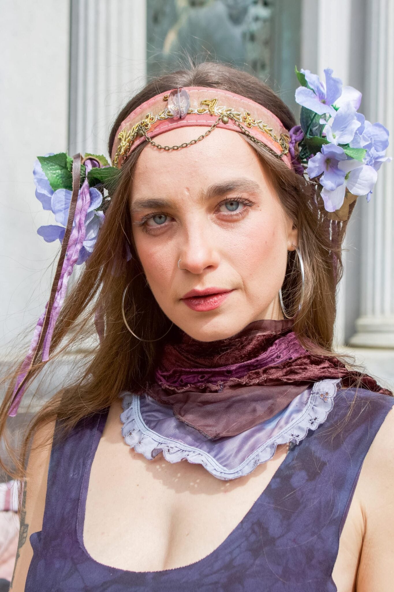 Made from a lovely collection of reclaimed materials, this Dusty Pink Fairy Crown Headband features a beautiful piece of Indian Saree fabric, flanked by large bunches of blue silk flowers, leather fringe, and detailed with antiqued brass hardware. A centerpiece of a smokey faux crystal adorns the forehead.