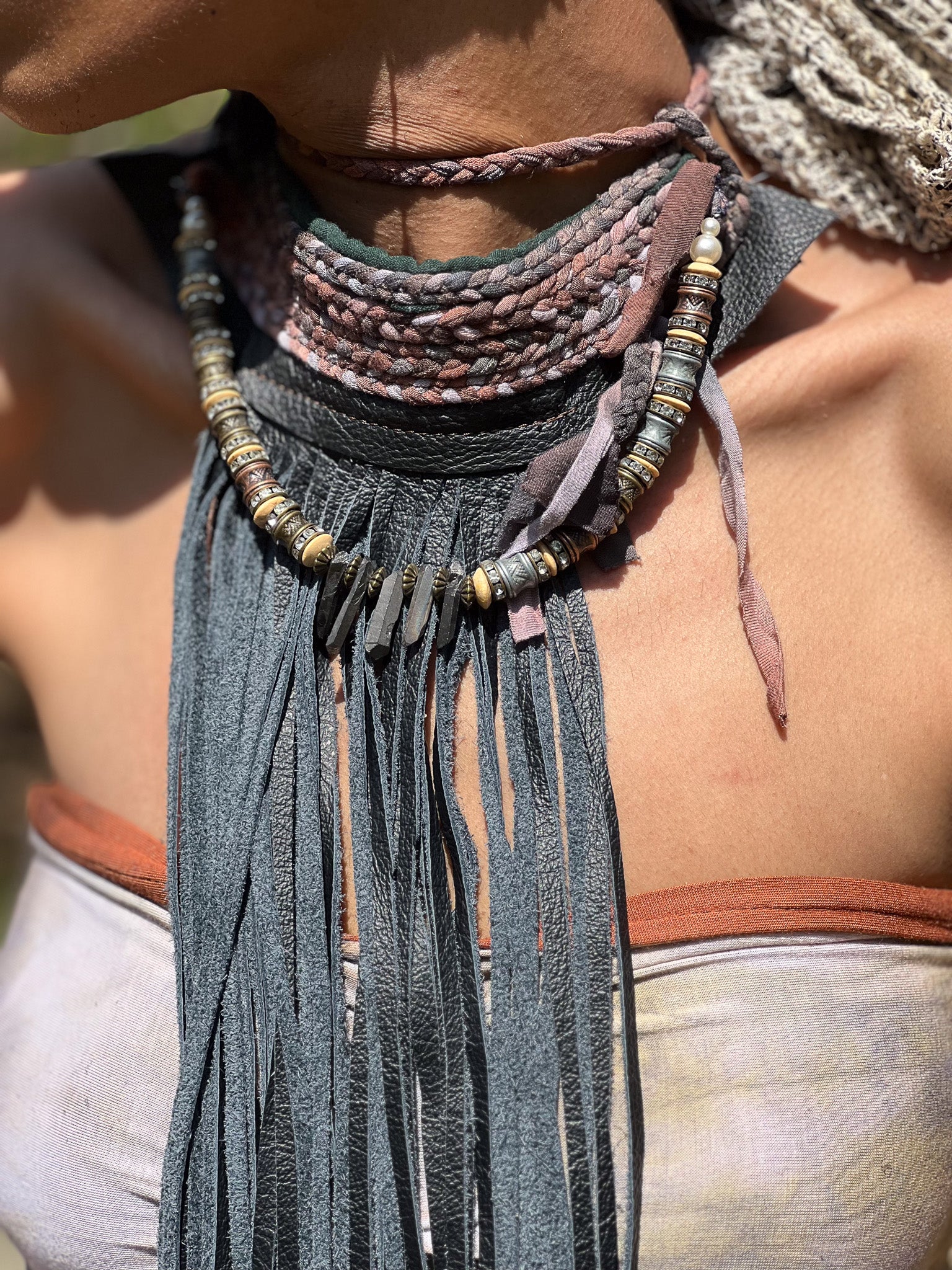 Elevate your style with our Electra Black Fringe & Braid Neckpiece. Crafted with long black recycled leather fringe and beaded embellishments, this handcrafted piece is completed with braided bamboo accents and a tie closure. Wear it as a statement piece for a unique and sustainable fashion choice.