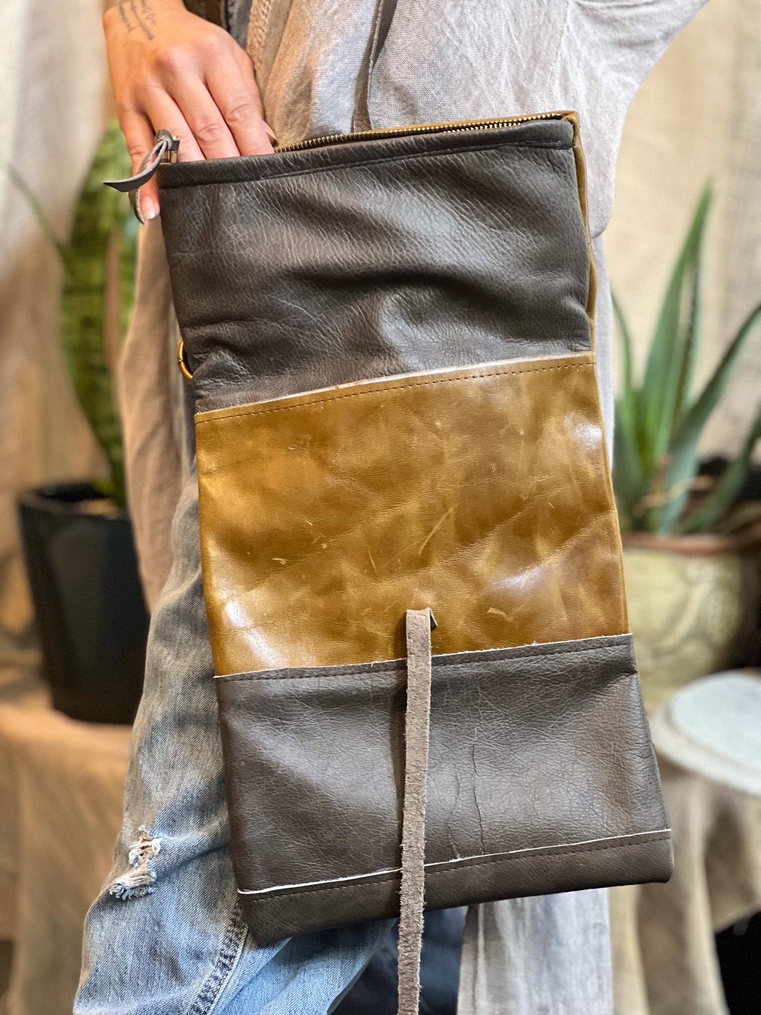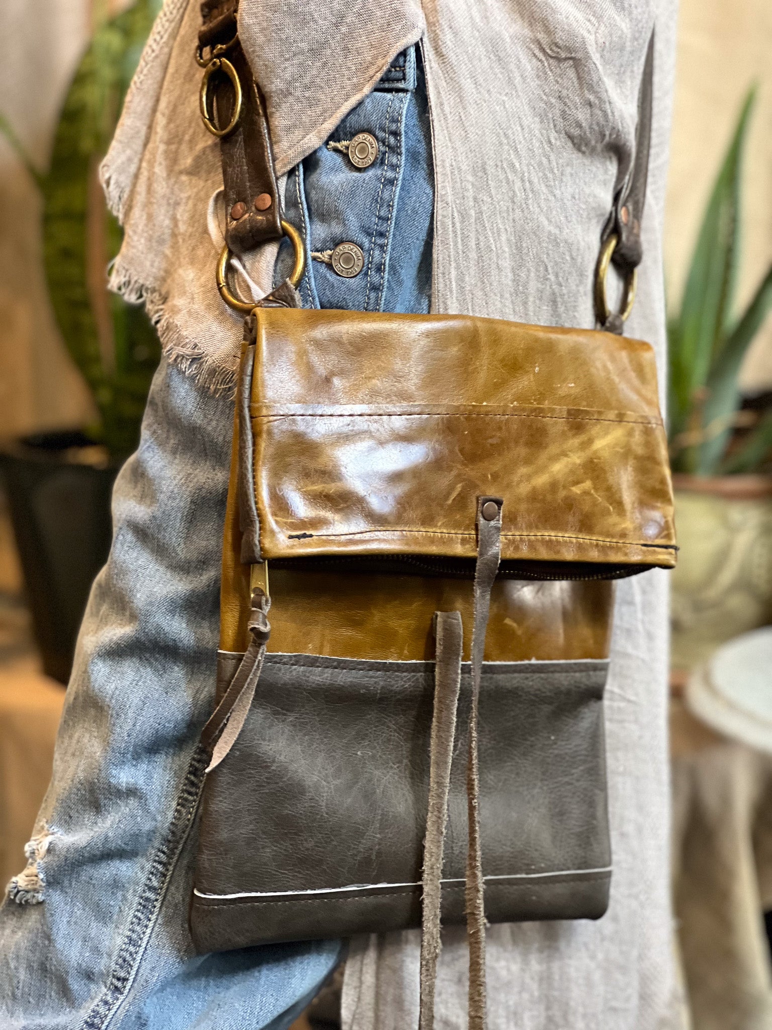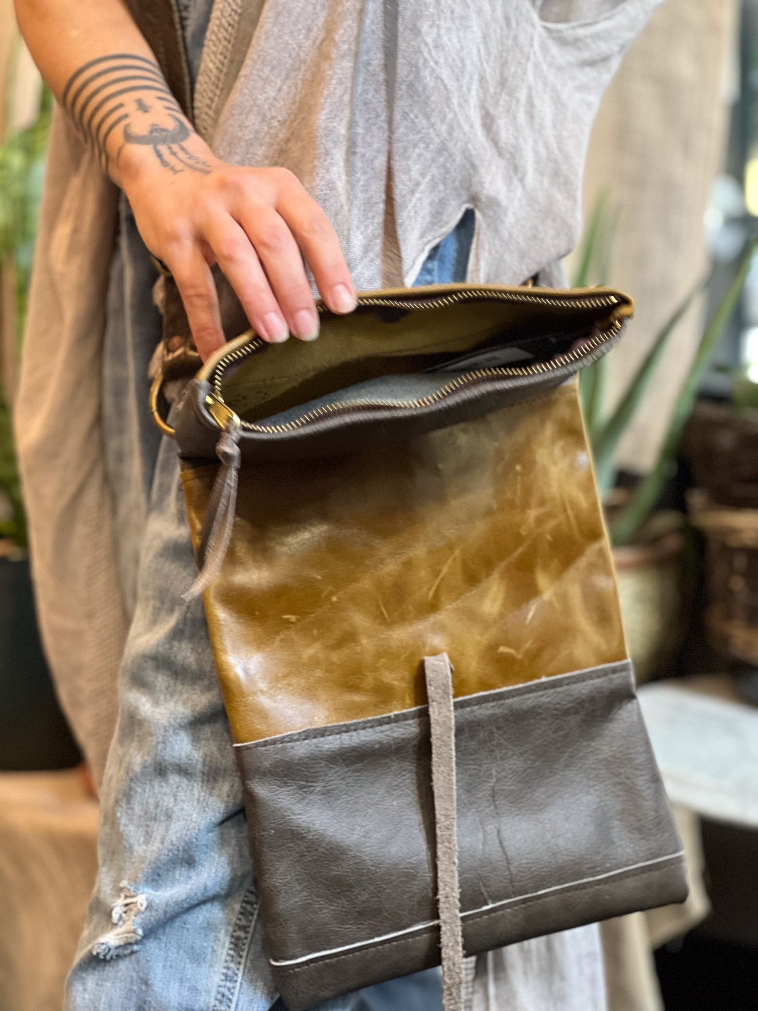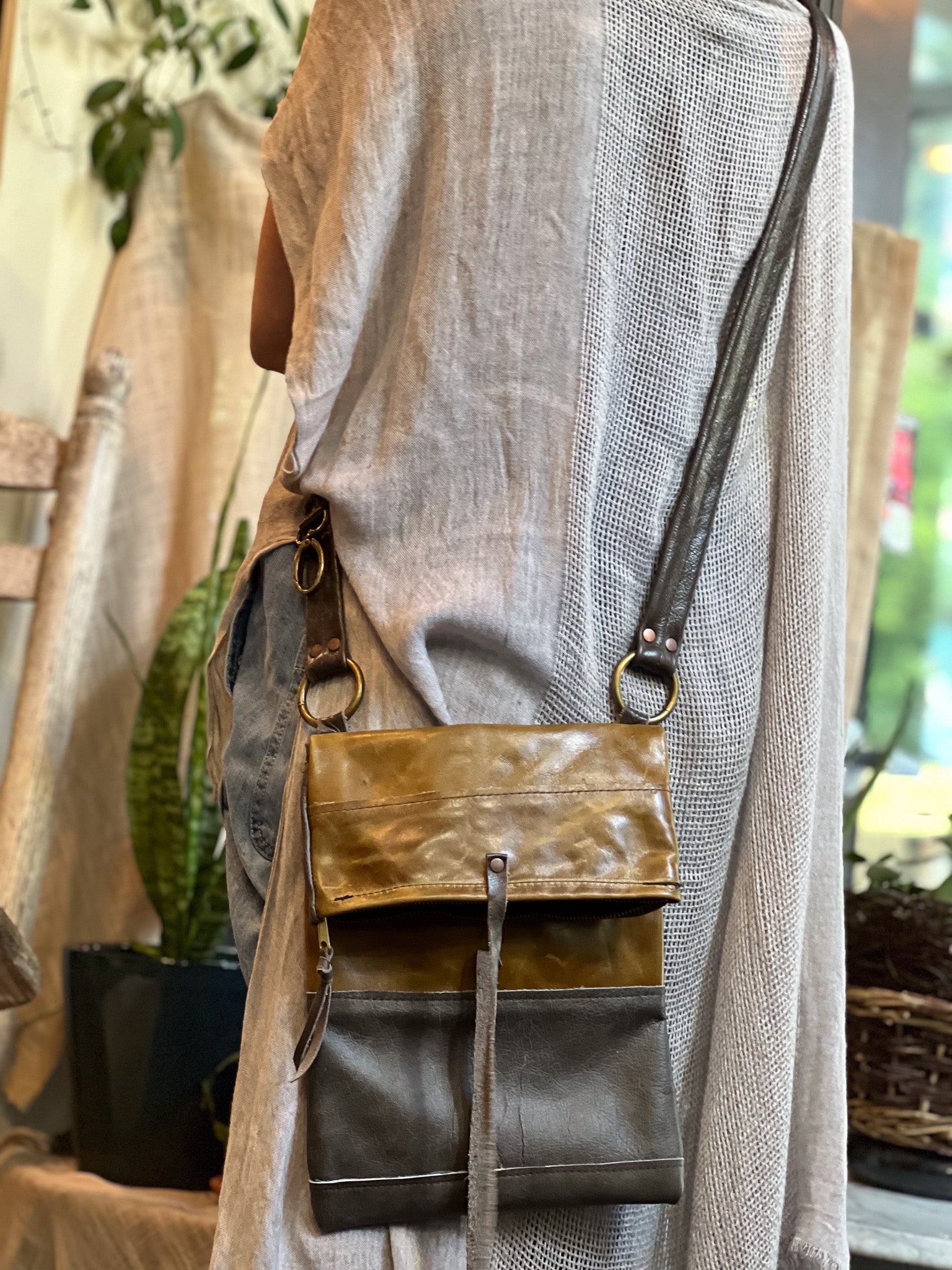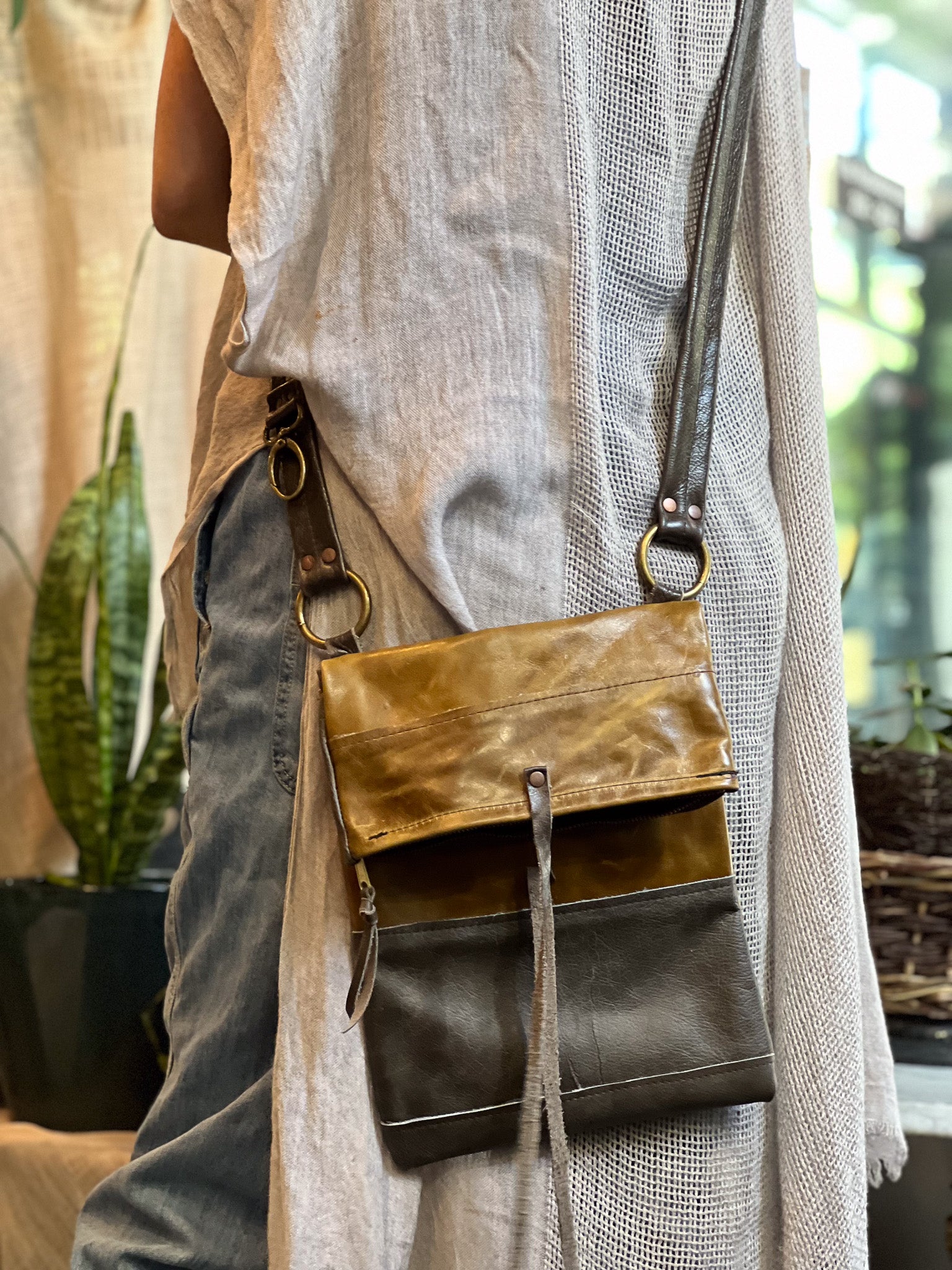 This Fold-over Leather Crossbody Bag combines expert craftsmanship with sustainable materials, featuring handcrafted pieces made from post-manufacture scraps. Its fold-over top design secures your essentials with a convenient zip-and-tie closure, while the spacious main pocket offers ample storage. Industrial hardware accents enhance durability and style, making it a versatile accessory for everyday use. The crossbody style ensures comfortable, hands-free wear, perfect for those who value both function and eco-conscious fashion. Features an antique brass key clip on the lower strap.