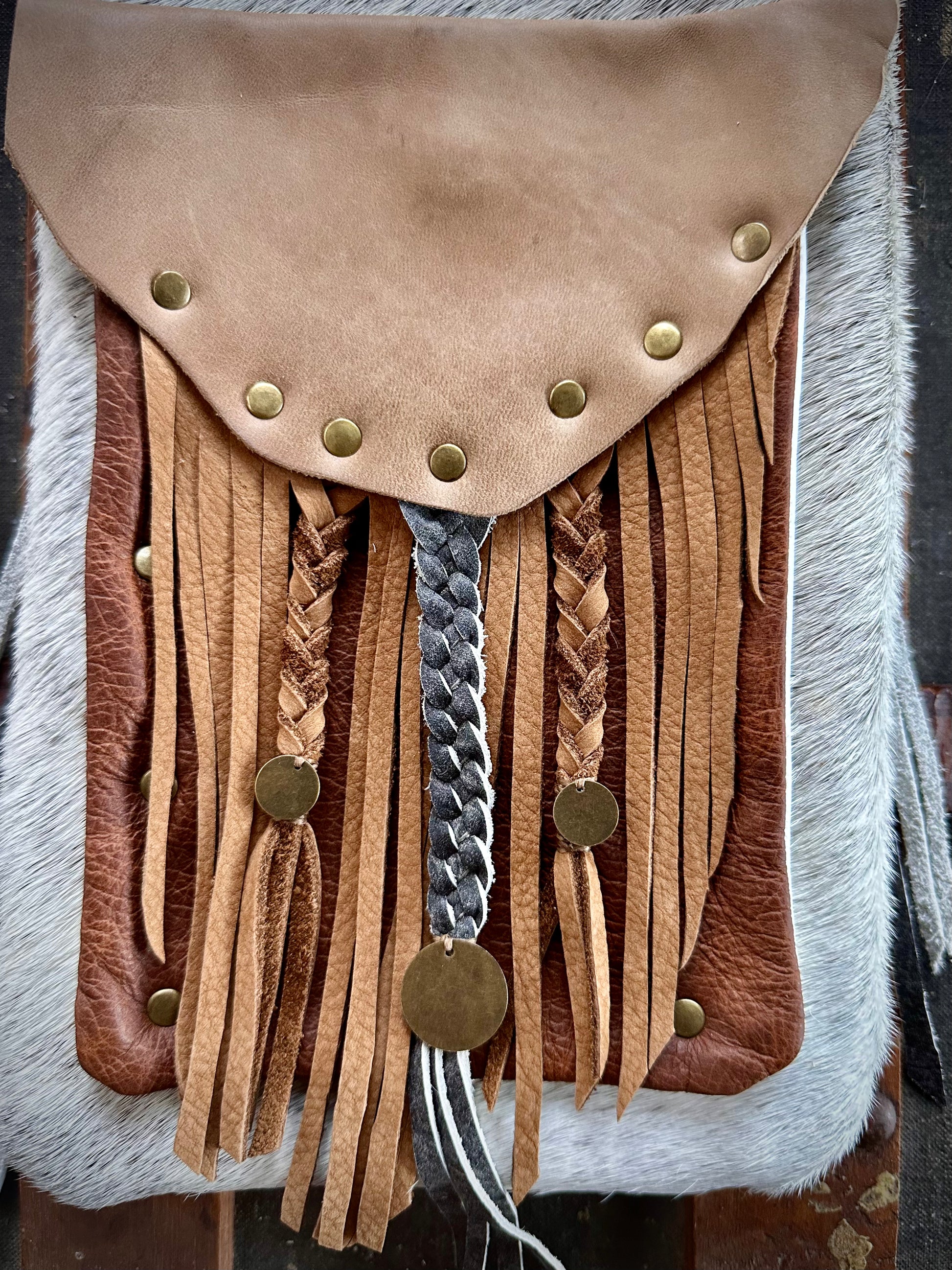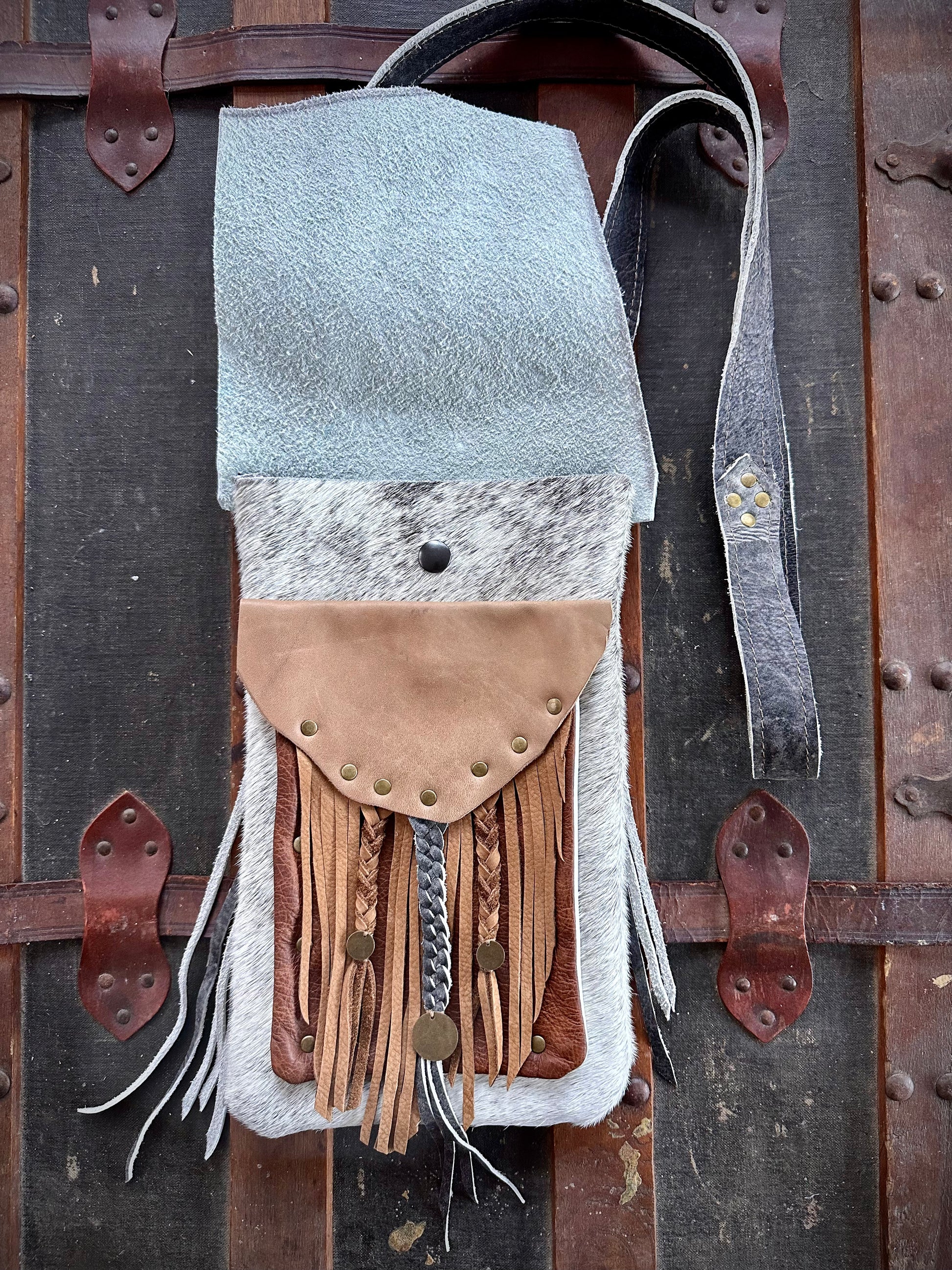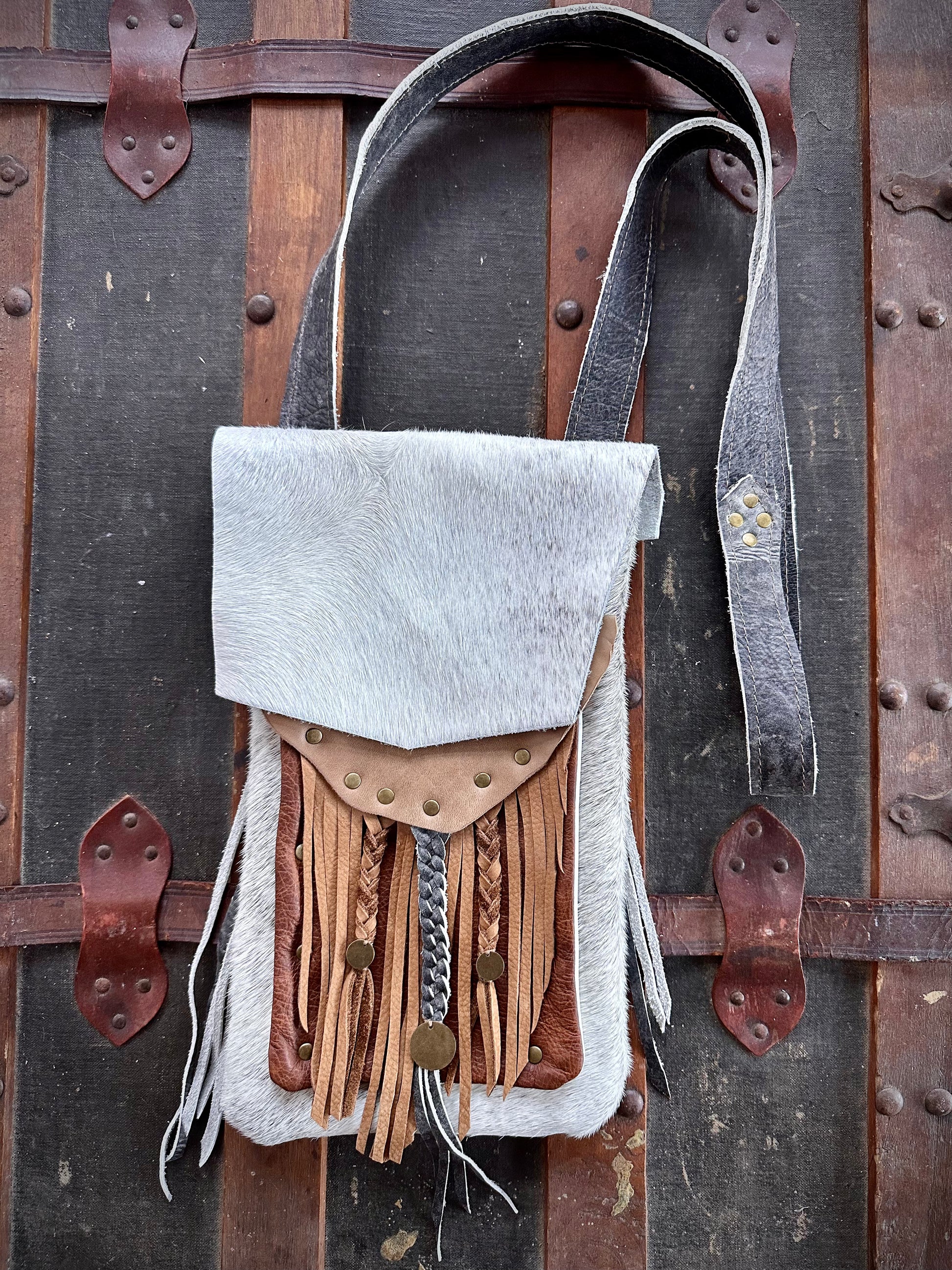 Constructed from all reclaimed, post-manufactured scrap leather, this low-profile, handcrafted leather purse features gorgeous hair-on-hide and two smaller pockets on the front and back sides of the purse. Detailed and designed by our in-house crafter, Wren, this stunning purse features hand-cut fringe, leather braids, and antiqued brass charms, chain, and hardware. It can serve as both your everyday bag and a decorative accent in your home when not in use.