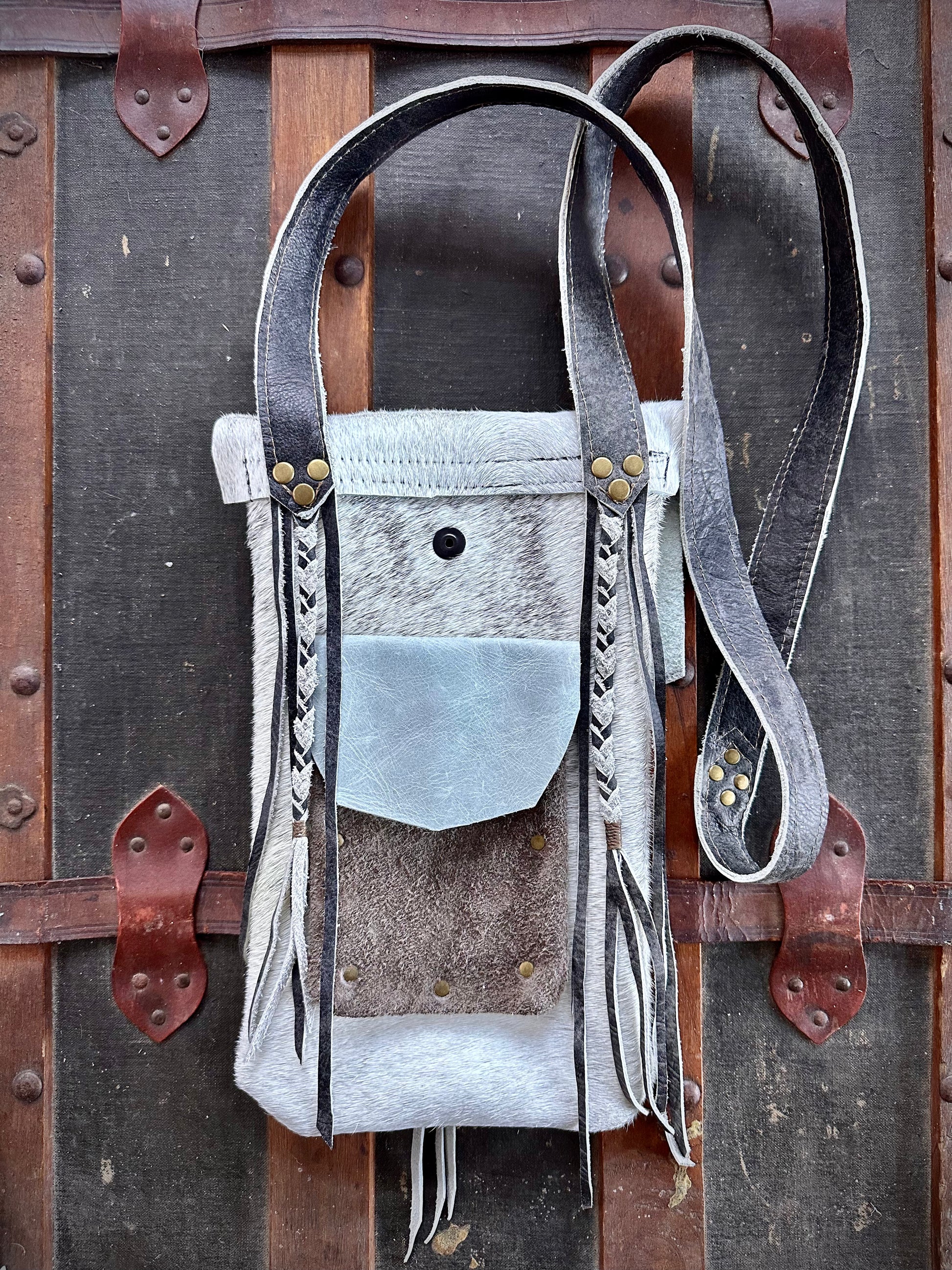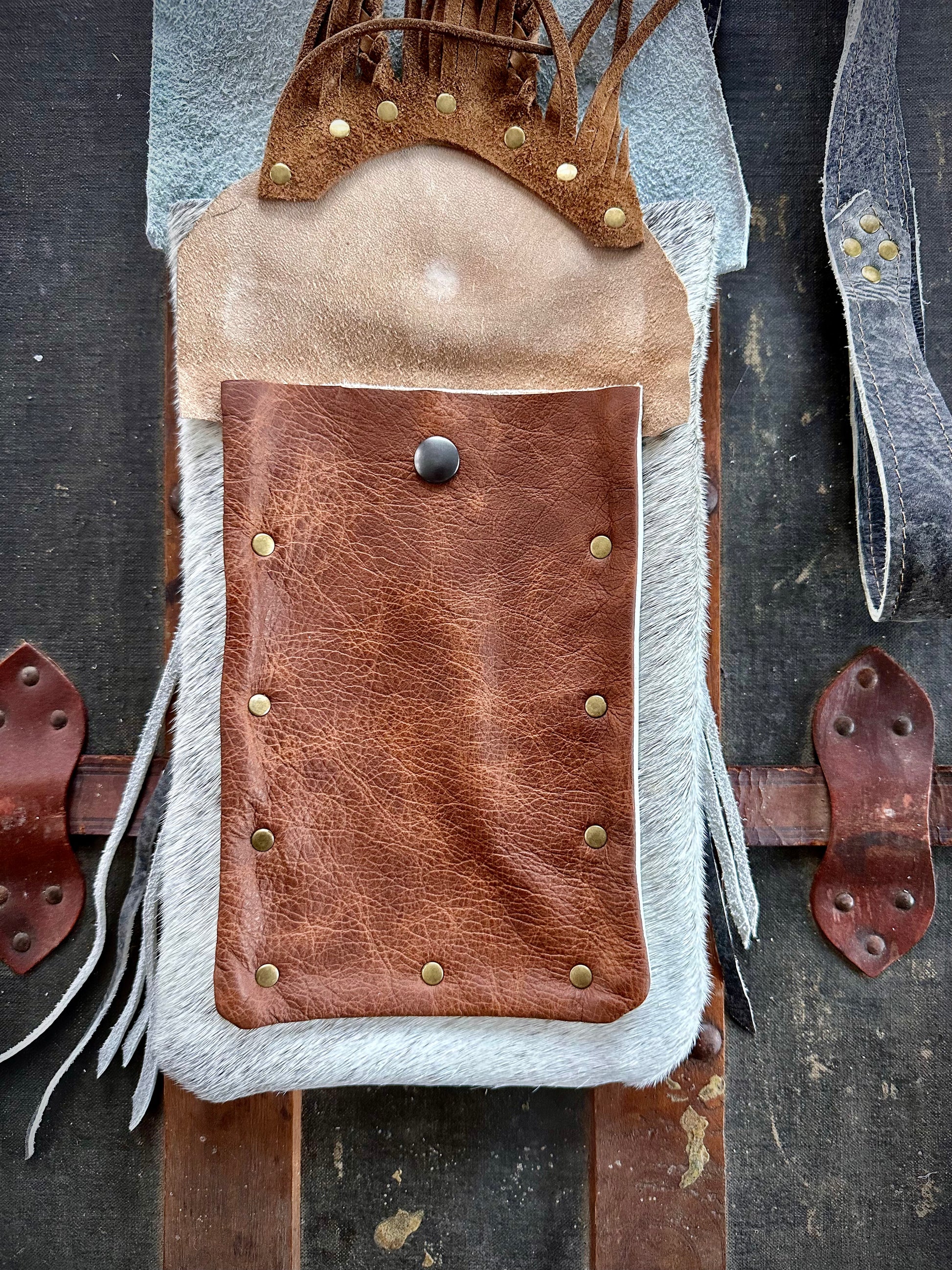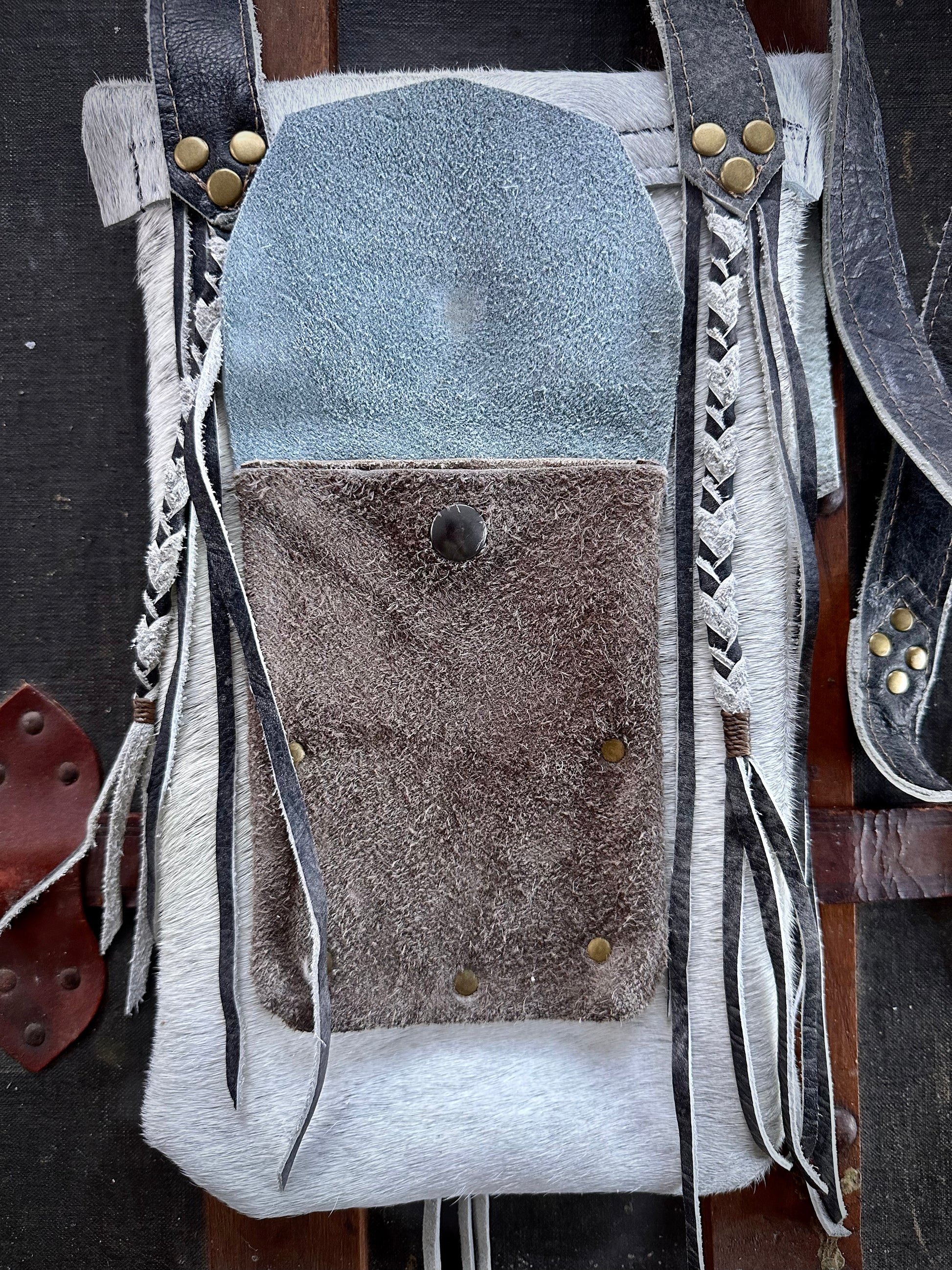 Constructed from all reclaimed, post-manufactured scrap leather, this low-profile, handcrafted leather purse features gorgeous hair-on-hide and two smaller pockets on the front and back sides of the purse. Detailed and designed by our in-house crafter, Wren, this stunning purse features hand-cut fringe, leather braids, and antiqued brass charms, chain, and hardware. It can serve as both your everyday bag and a decorative accent in your home when not in use.