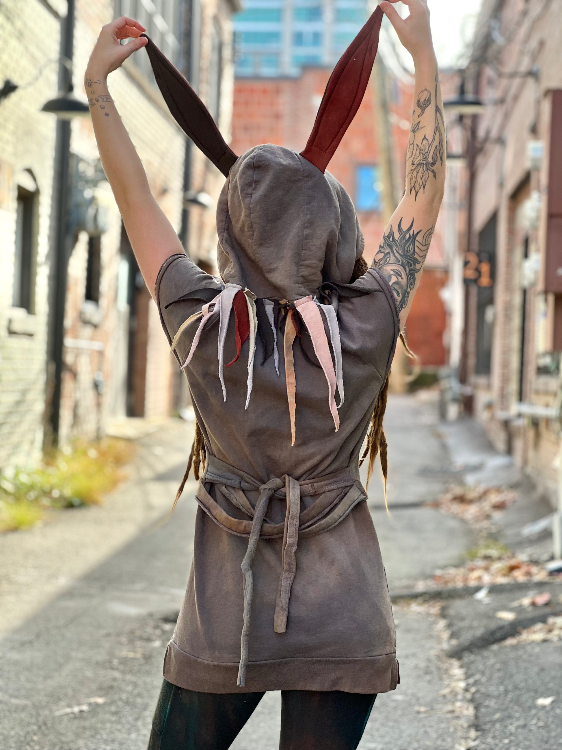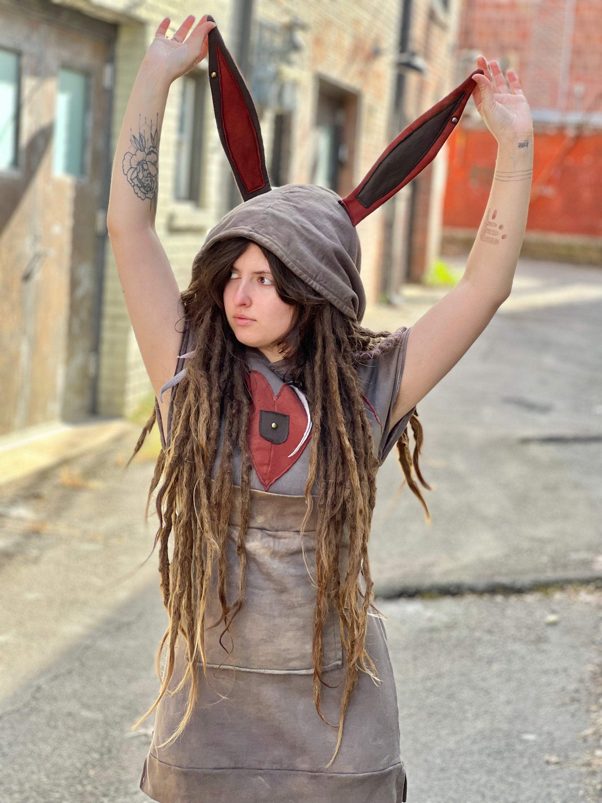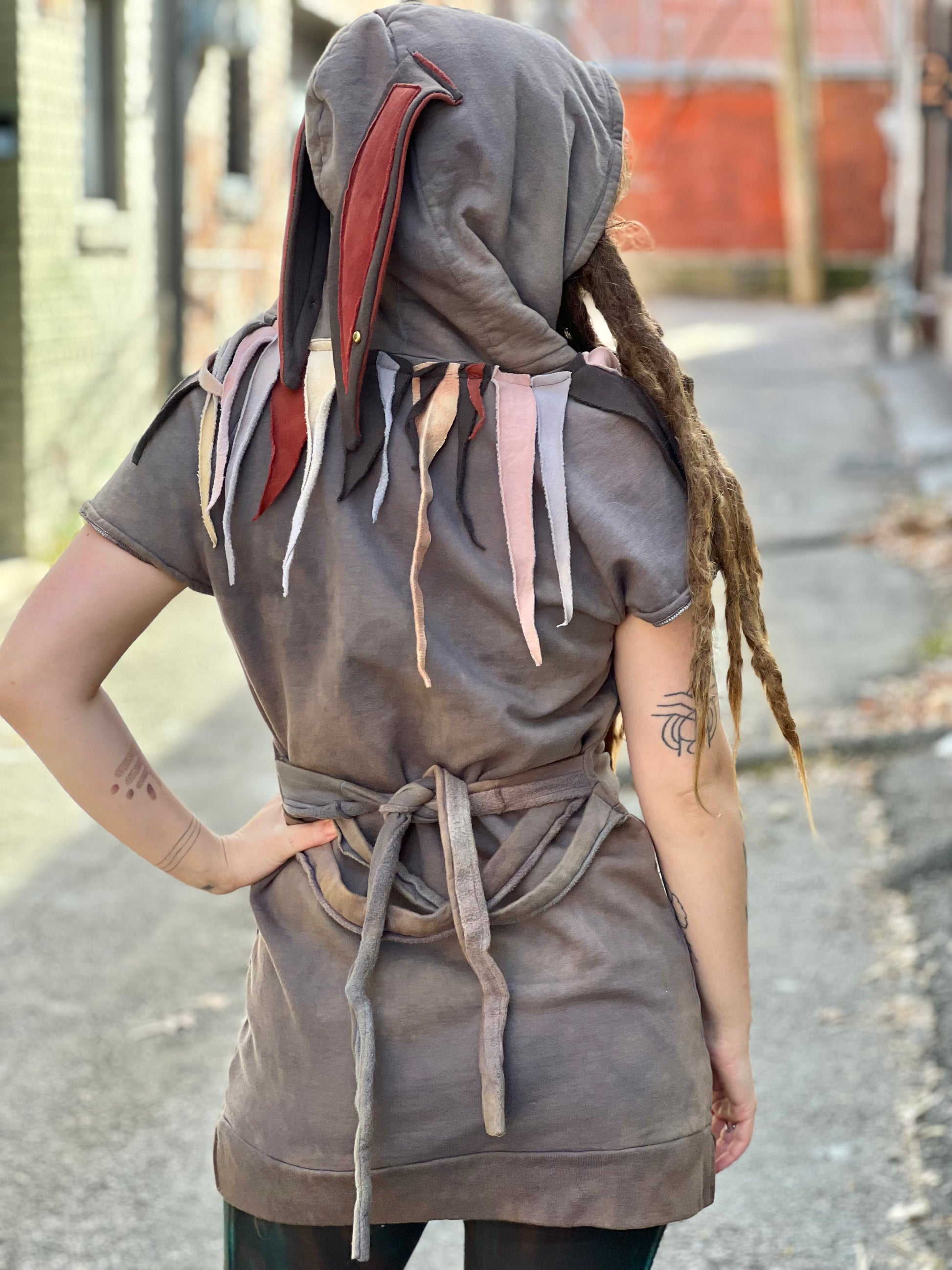 Crafted from Liberty Organics cotton, this whimsical tunic combines comfort with playful design details. The cozy hood and attached bunny ears evoke a circus-inspired aesthetic, while a heart patch adds a touch of sentiment. Made entirely from premium 100% cotton, it's soft against the skin and built to last. Perfect for those who appreciate handcrafted pieces with personality and sustainable materials.