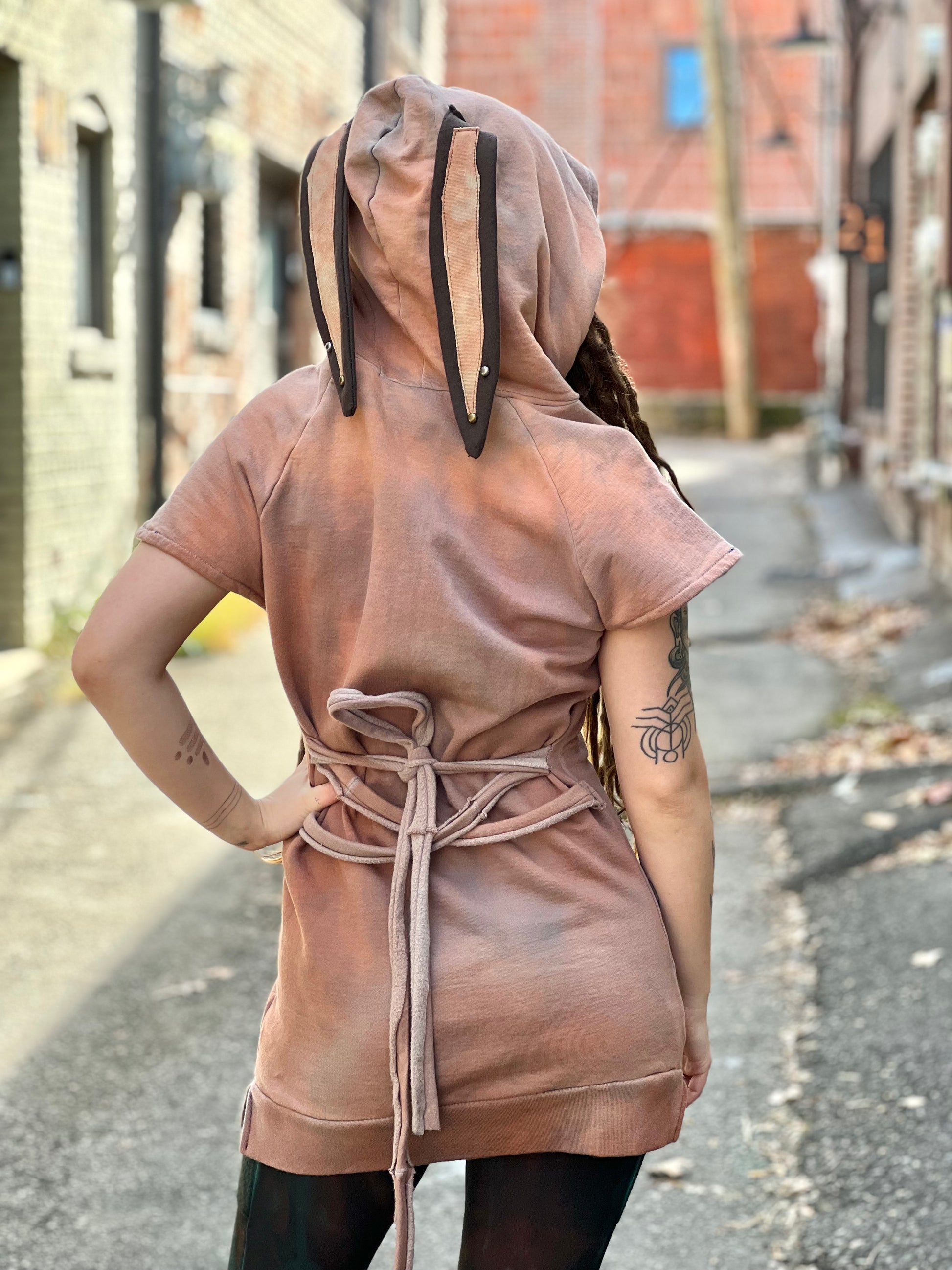 This handcrafted tunic combines artisanal design with sustainable materials, featuring 100% organic cotton from Liberty Organics. The charming mauve tone is complemented by whimsical bunny ear details and a decorative star patch, while adjustable cincher ties at the back provide a customizable fit. Perfect for those seeking quality craftsmanship with an eco-conscious approach.