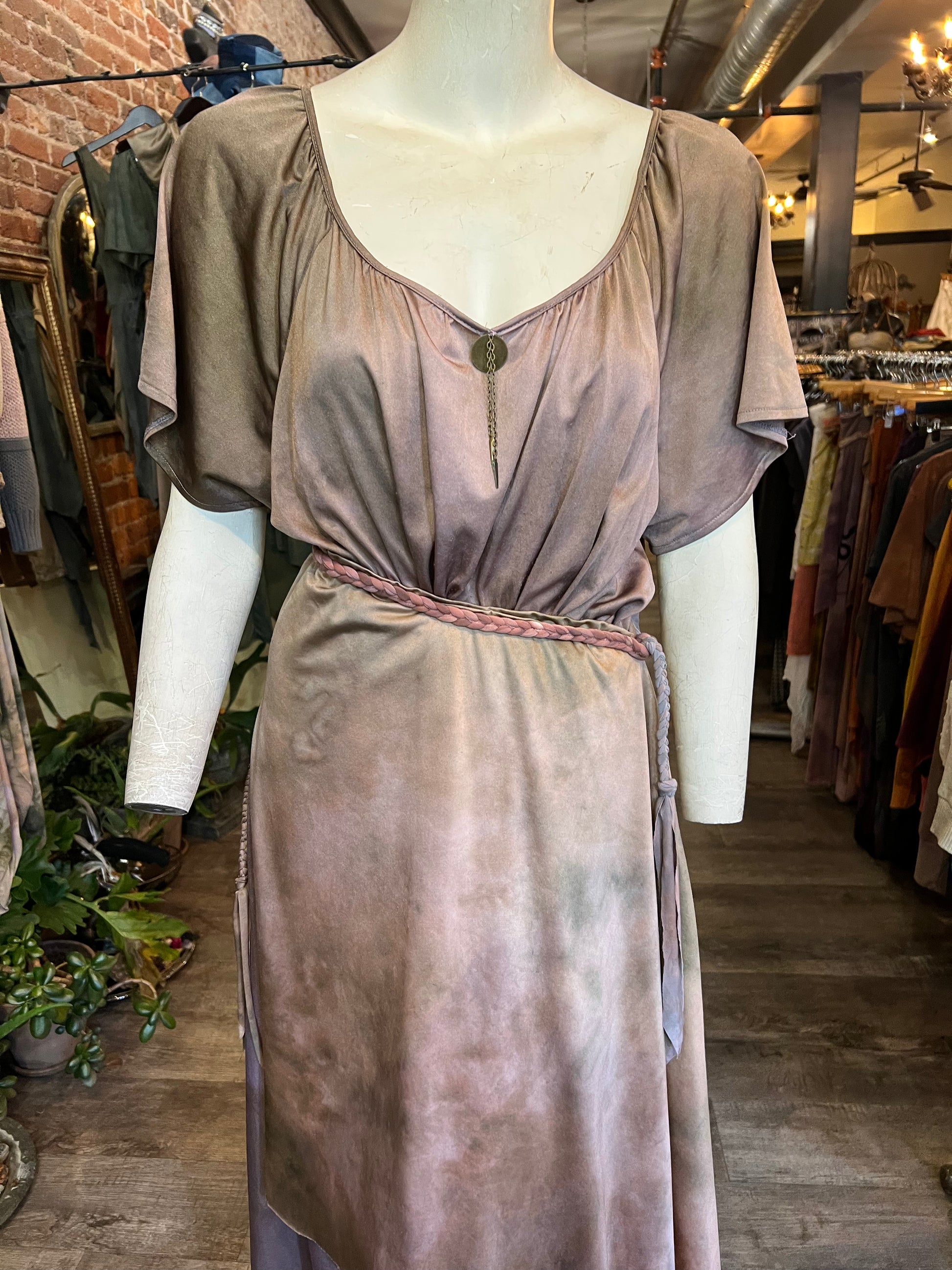 This maxi dress offers an effortless beauty, with hand-dyed nylon material, braided ties and an antiqued brass chain and disc detail at the neckline.