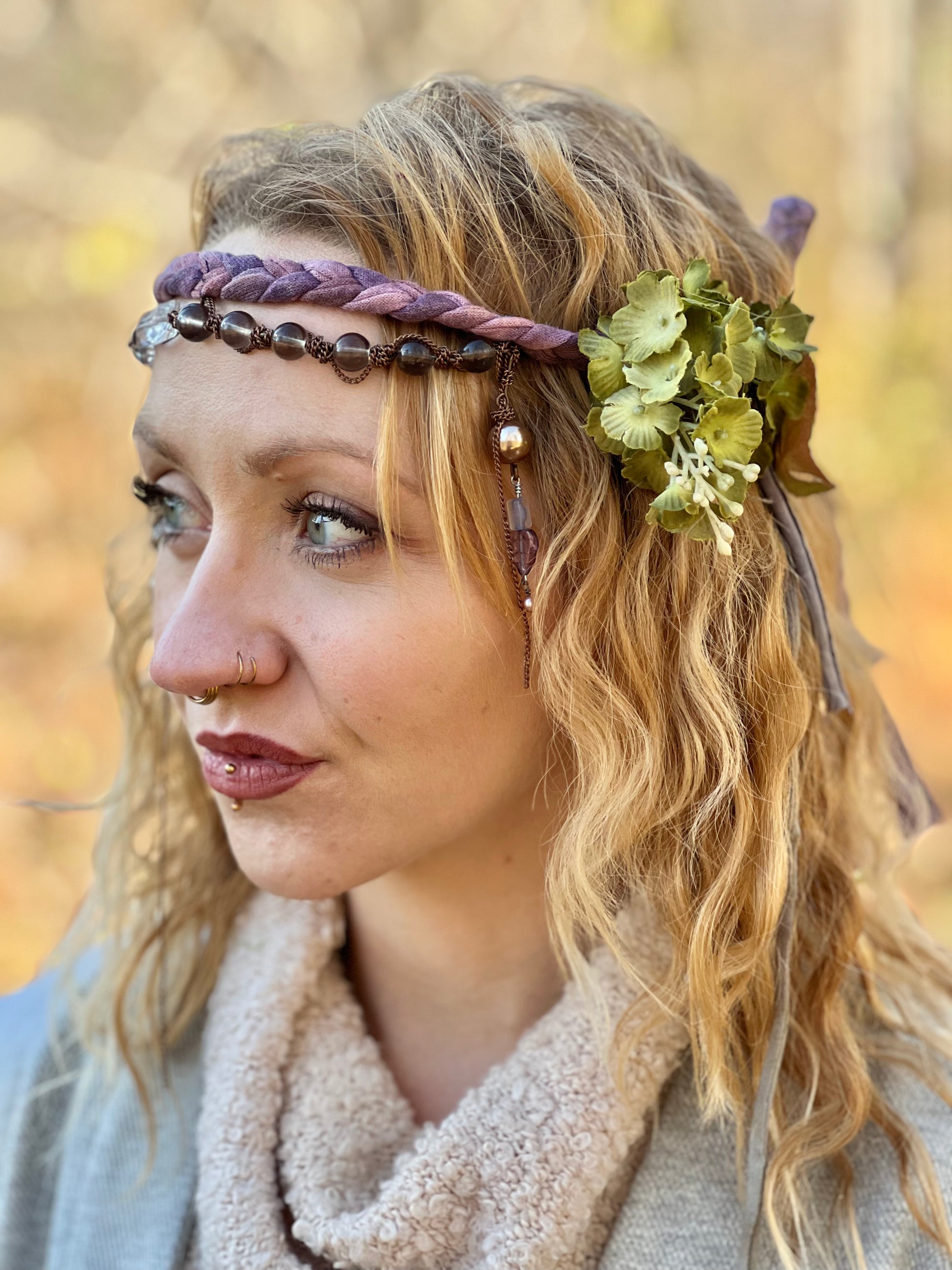 Handcrafted from luxurious bamboo fabric, this versatile braided accessory features enchanting faux floral accents adorned with delicate charms and jewels. Wear it as a whimsical headband, elegant choker, or cinched belt to elevate any look with fantastical flair. The orchid and mauve palette captures an ethereal aesthetic, making it an essential piece for festival season and beyond. Each braid is meticulously constructed to ensure durability without compromising its delicate, otherworldly charm.