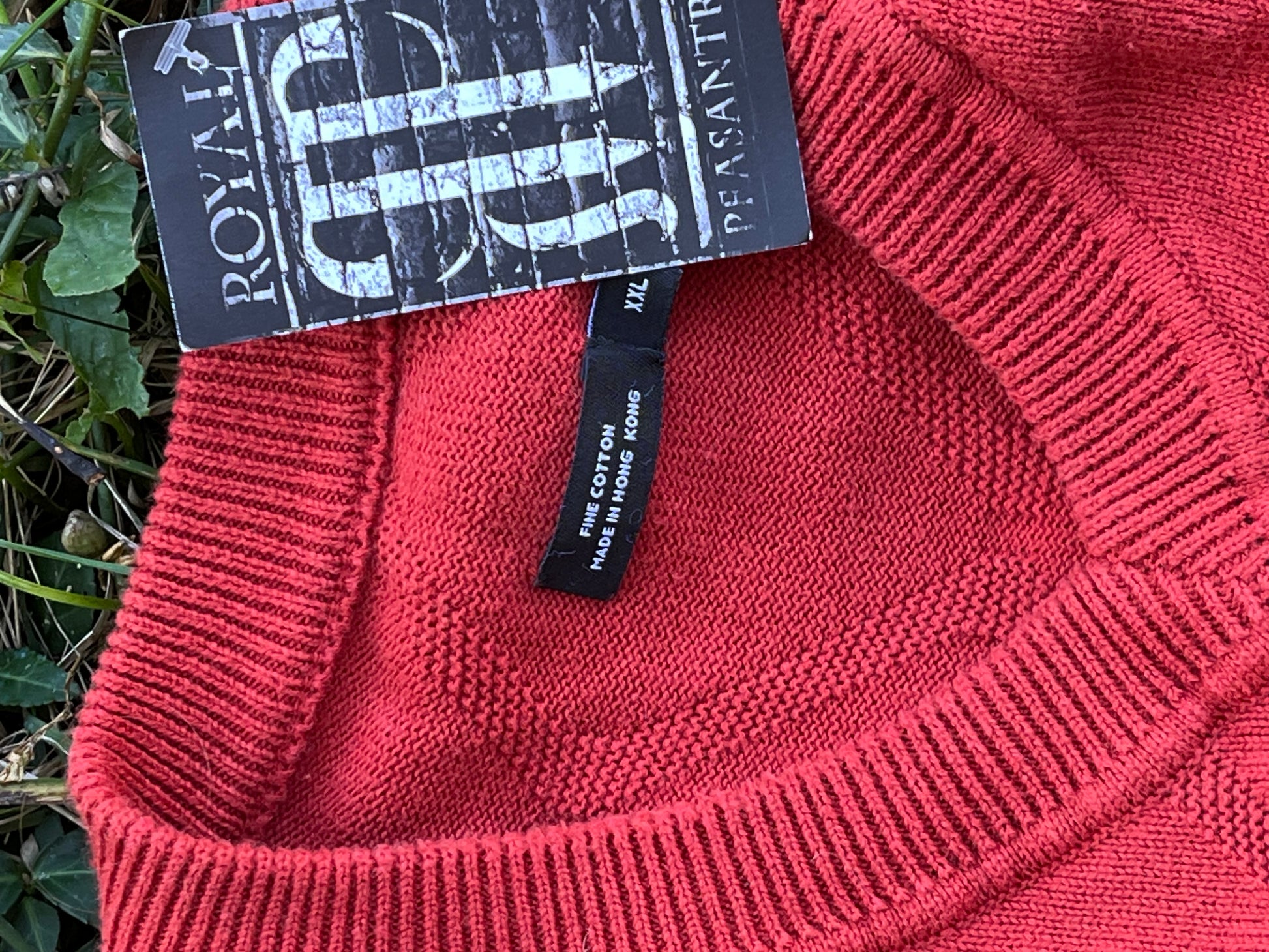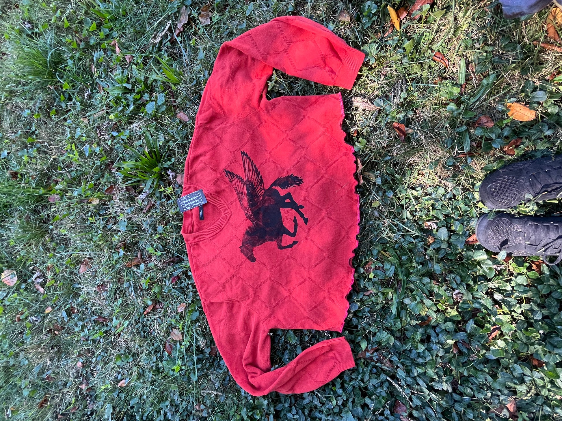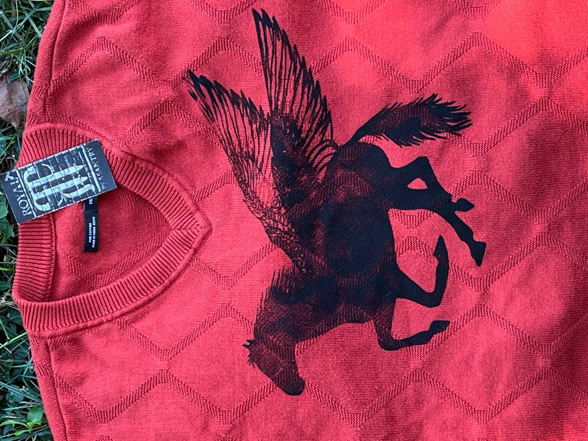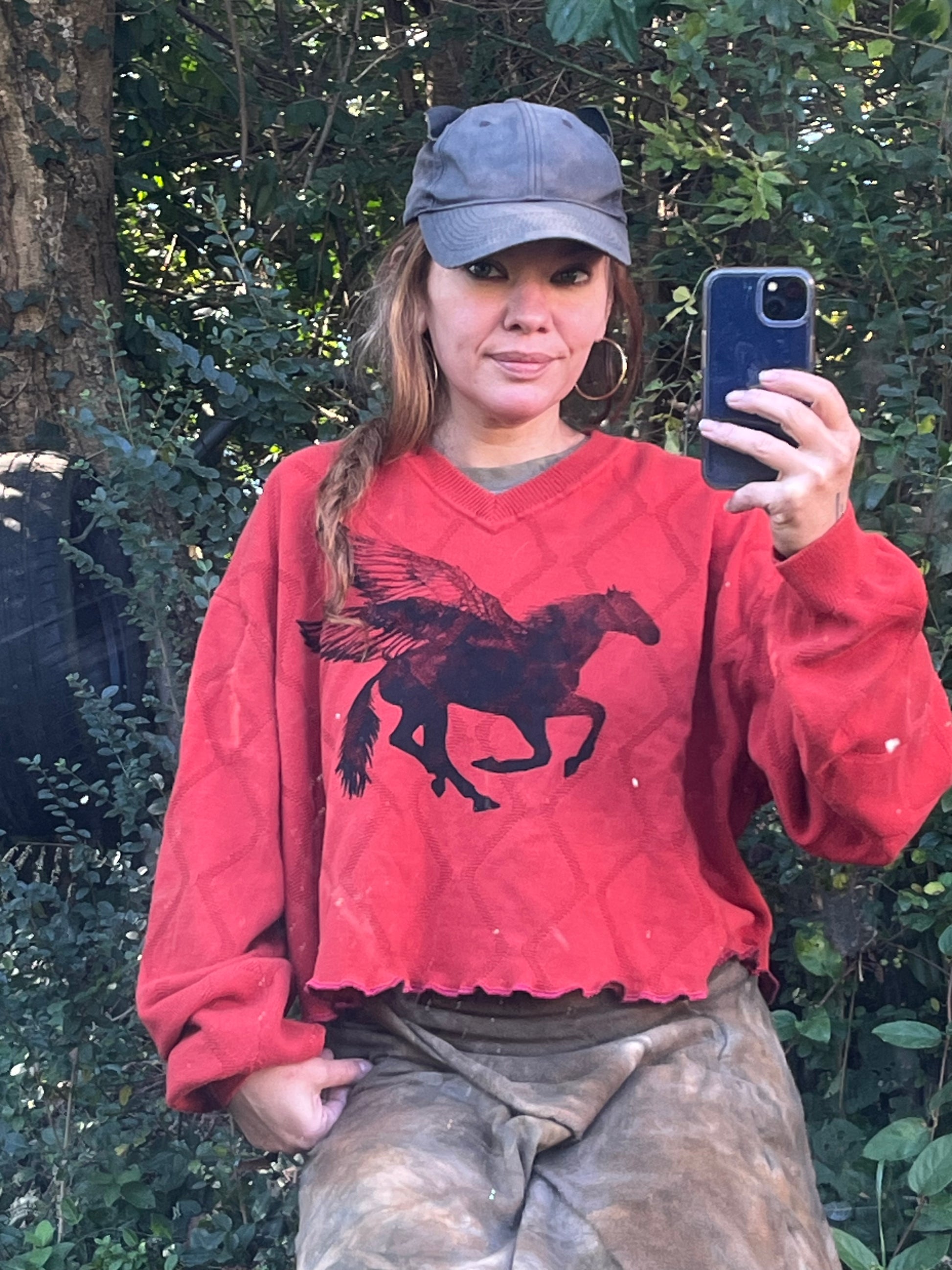 This upcycled, cropped longsleeve features a vivid bright orange hue that enhances its striking appeal. Designed with a flattering v-neckline and adorned with a distinctive Pegasus print, it offers effortless styling versatility. Ideal for adding a bold, sustainable statement to any wardrobe.