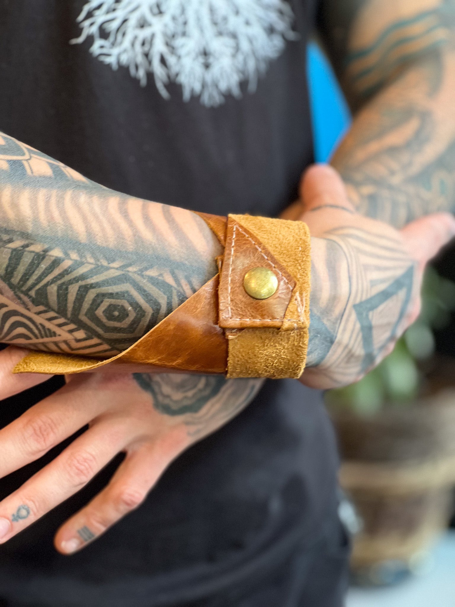 The Sienna Scrap Leather Cuff is expertly handcrafted using recycled leather from Vanguard, showcasing a warm sienna color that emphasizes its unique character. Designed with an industrial snap closure, this cuff offers both secure wear and a bold, utilitarian aesthetic. Combining sustainable materials with meticulous craftsmanship, it delivers a refined accessory that stands out for its durability and style.