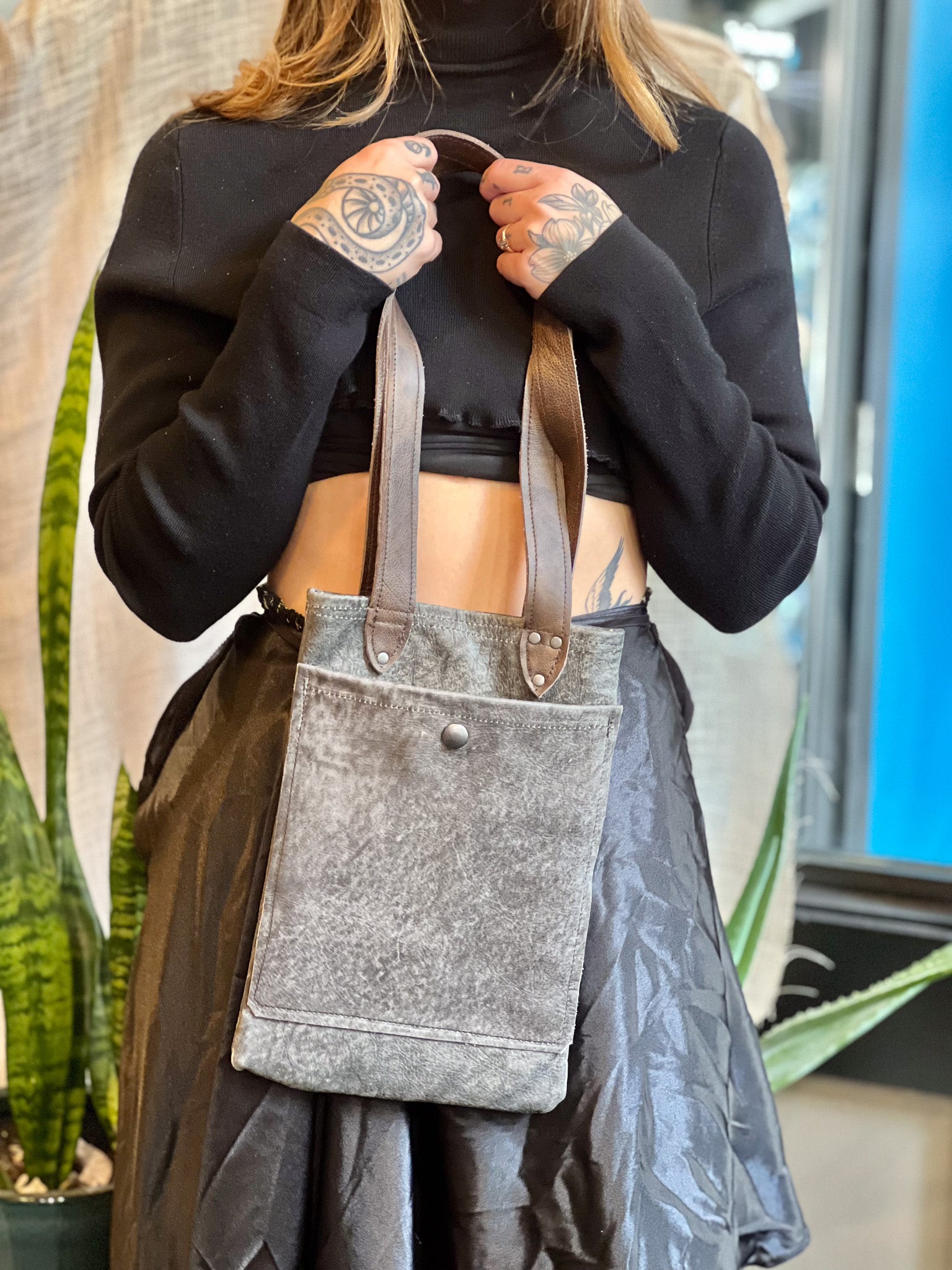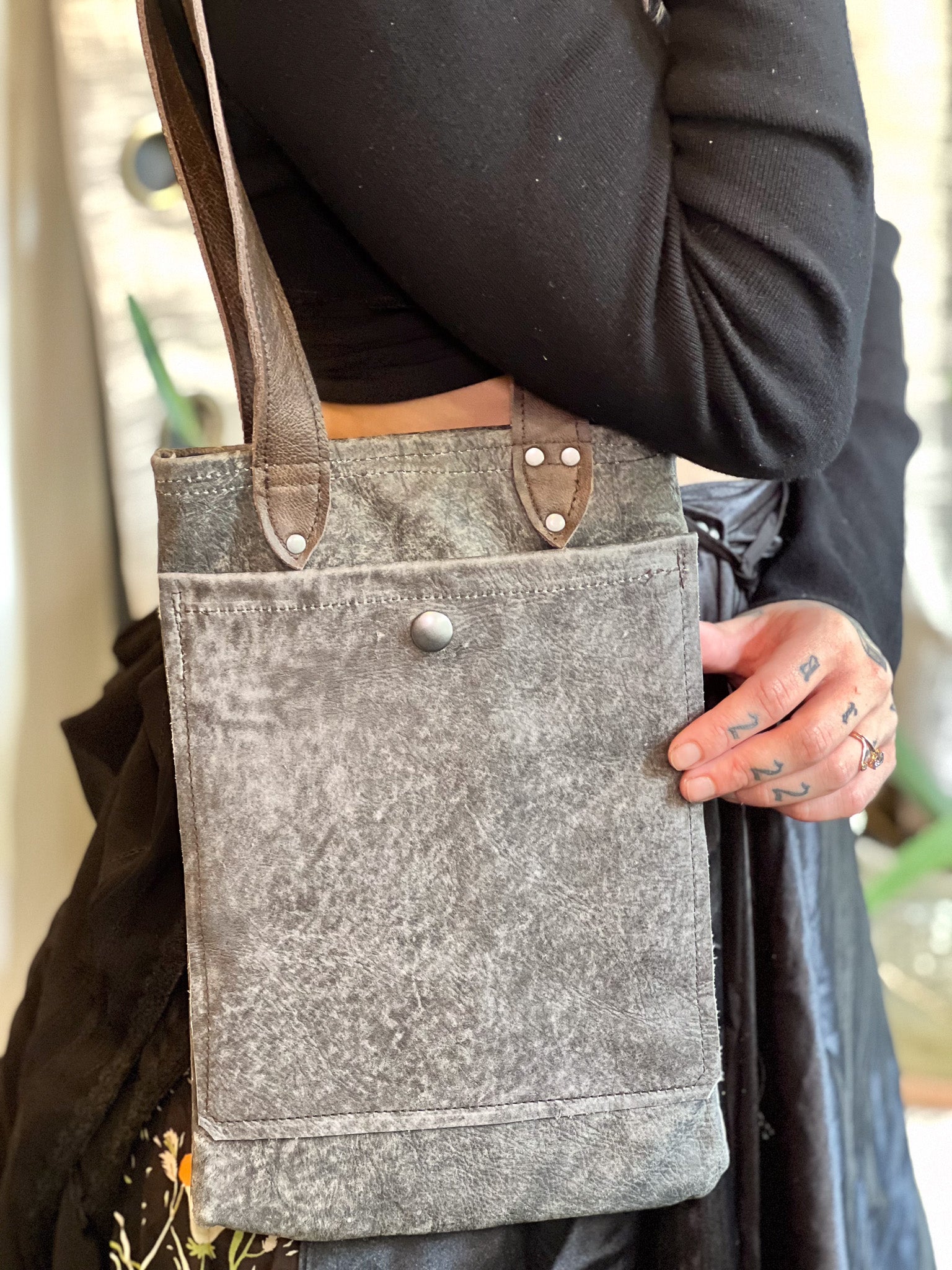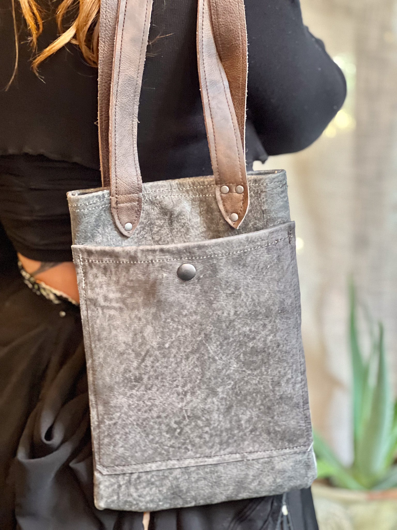 Crafted from premium post-manufactured leather scraps sourced from Vanguard, this Smokey Grey Leather Mini Tote features durable industrial hardware and secure snaps for longevity. Its short brown leather handle provides a comfortable handbag feel, while the outer pocket offers convenient storage. Inside, a fabric lining ensures the interior stays clean and organized, making this tote a refined choice for everyday use.
