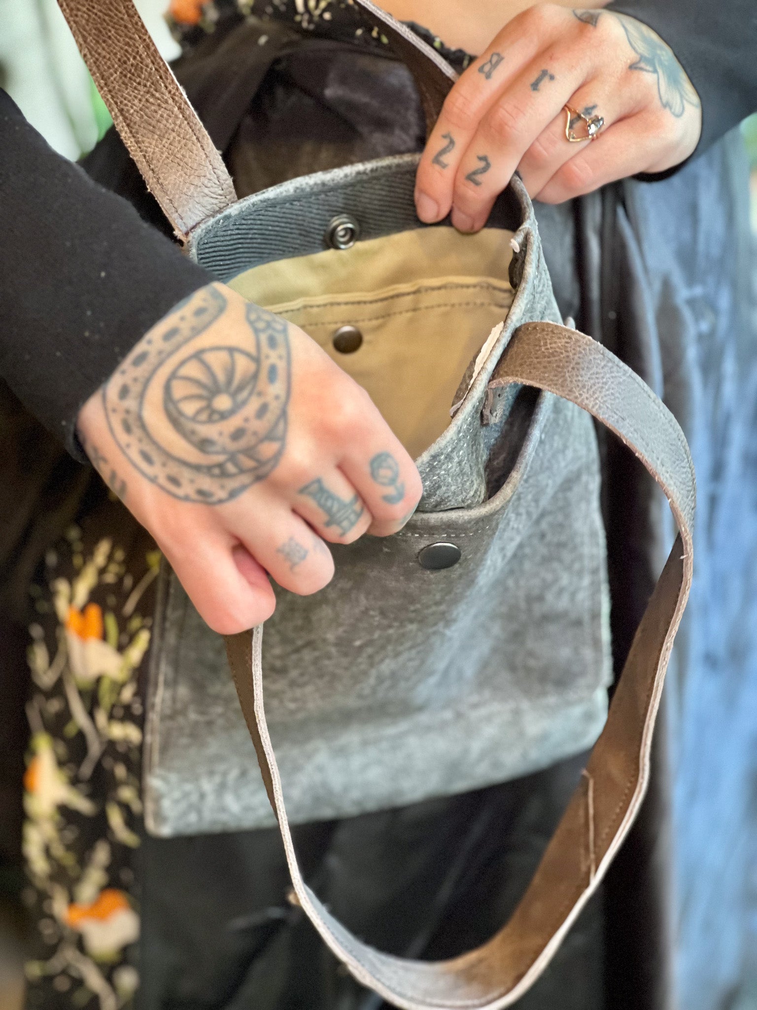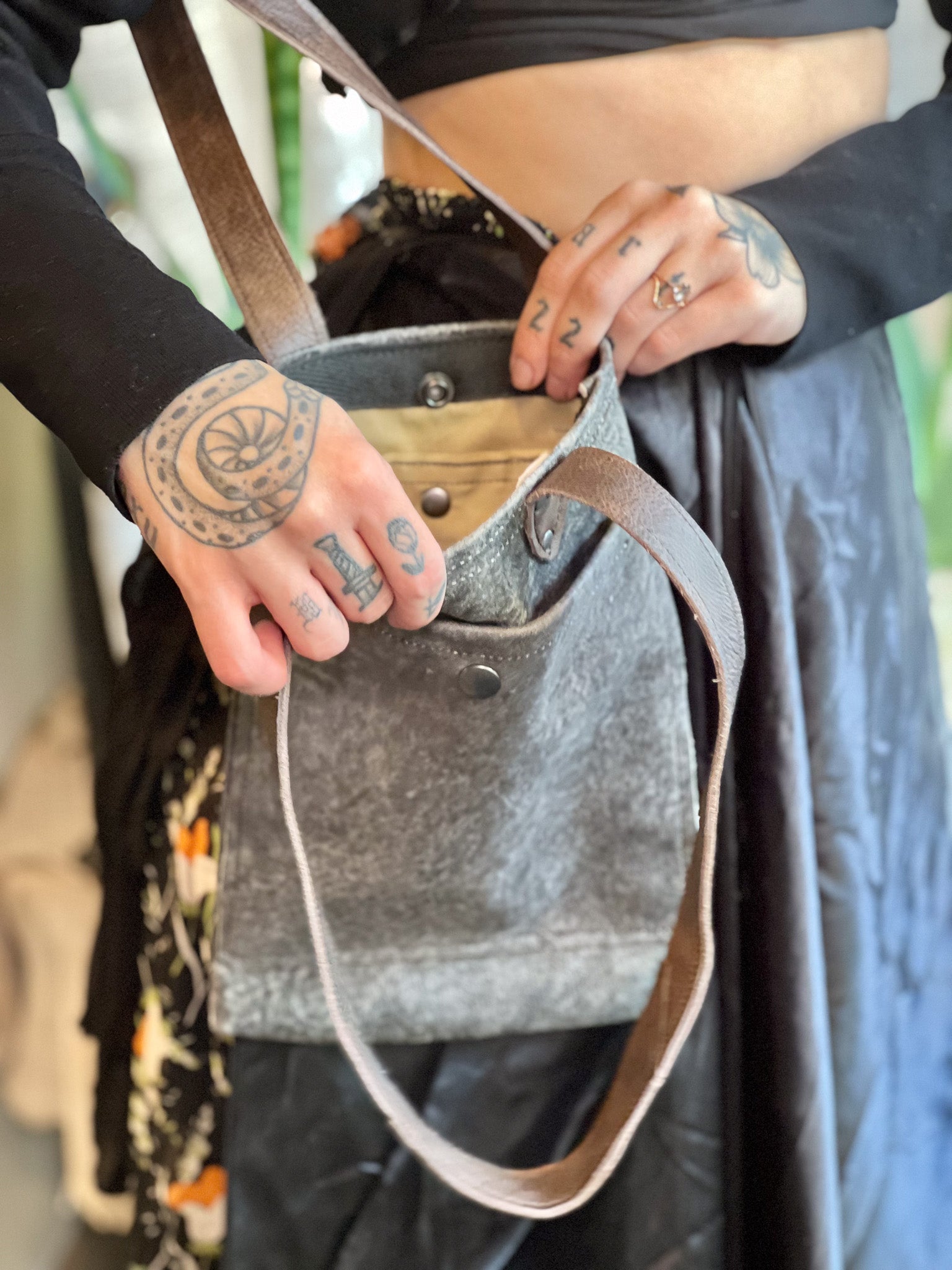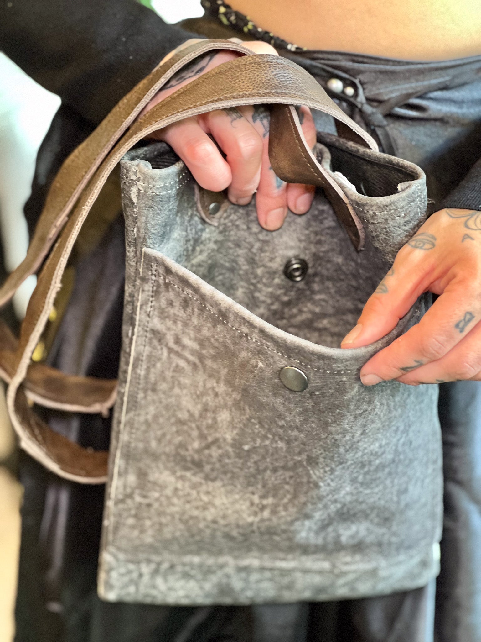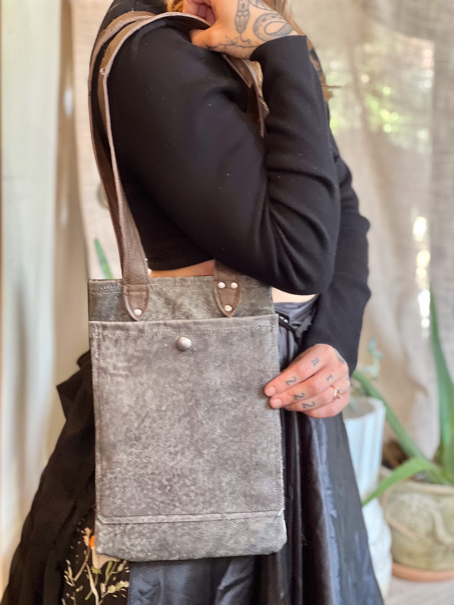 Crafted from premium post-manufactured leather scraps sourced from Vanguard, this Smokey Grey Leather Mini Tote features durable industrial hardware and secure snaps for longevity. Its short brown leather handle provides a comfortable handbag feel, while the outer pocket offers convenient storage. Inside, a fabric lining ensures the interior stays clean and organized, making this tote a refined choice for everyday use.